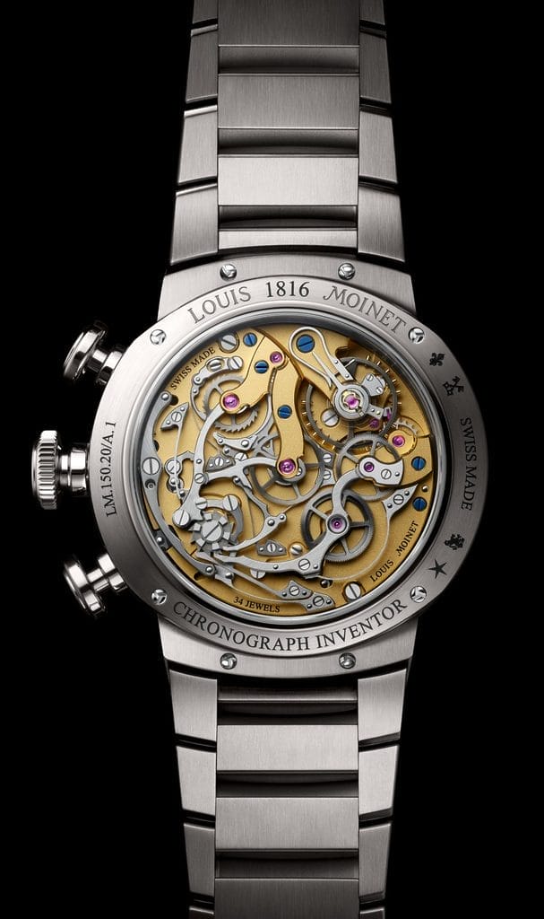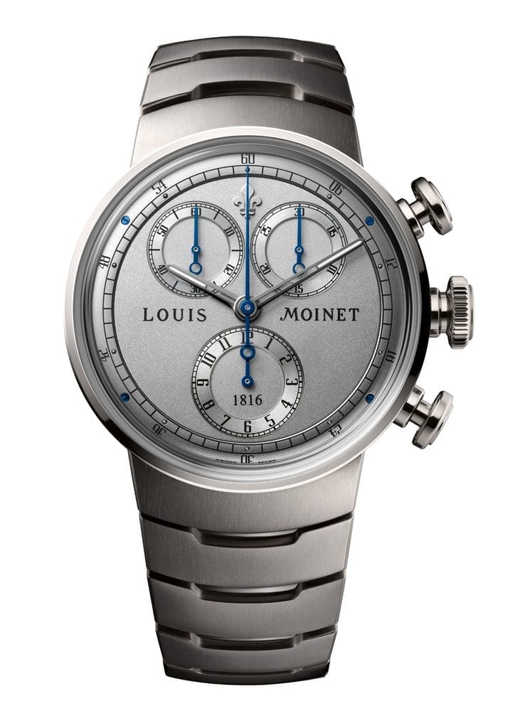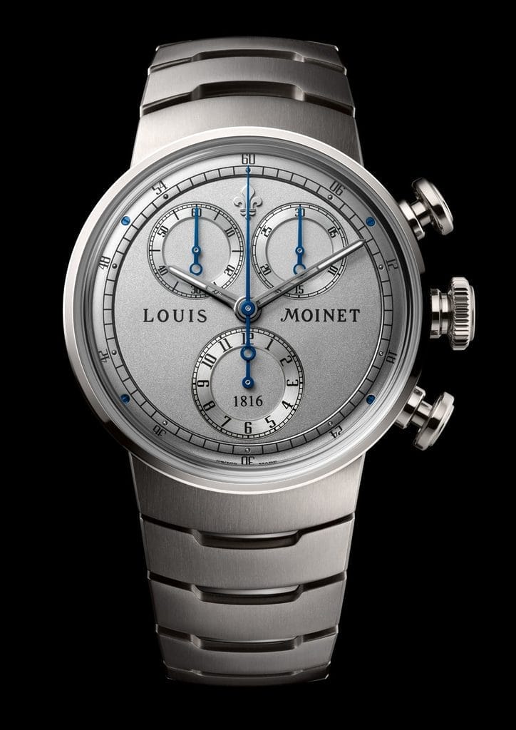Les marquages, dont la date 1816 et le nom Louis Moinet, sont gravés dans une typographie inspirée du modèle historique. Les aiguilles centrales et des compteurs sont en acier bleui, tandis que les aiguilles des heures et des minutes sont ajourées, avec une pointe luminescente pour une meilleure visibilité sur le cadran rhodié.
