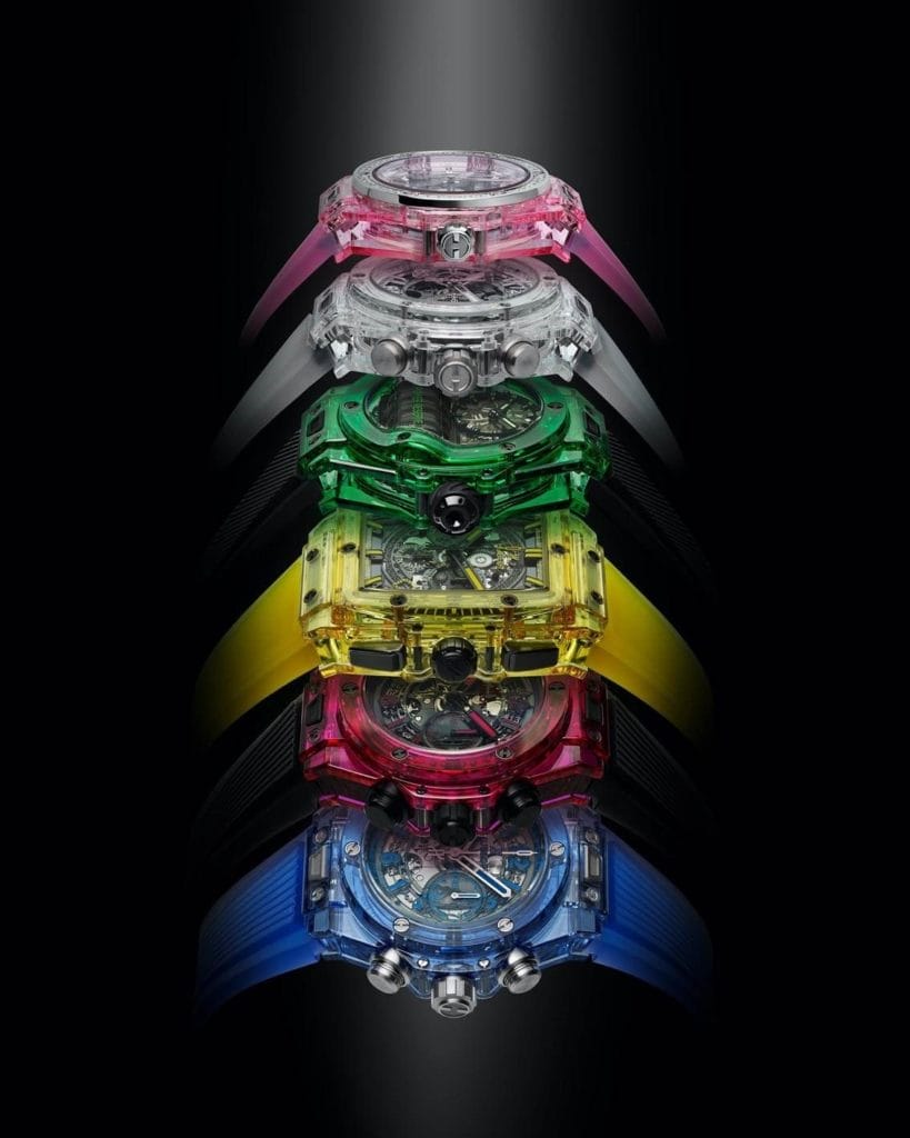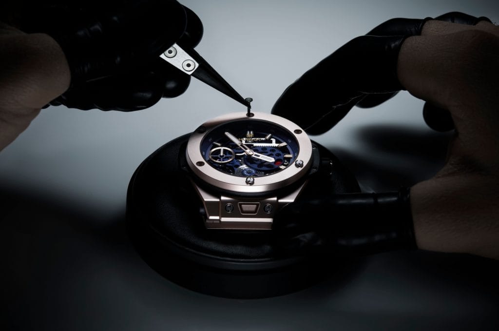 Inscrits dans l’ADN Hublot, les matériaux sont des attributs essentiels des montres, pour leurs qualités esthétiques et leur résistance aux rayures et au vieillissement. Depuis sa première association à un boîtier en or, en 1980, le caoutchouc est LE matériau incontournable et emblématique de la marque. De même, le Magic Gold, développé en partenariat avec l’Ecole Polytechnique Fédérale de Lausanne (EPFL) et produit dans la fonderie de Hublot, demeure le seul alliage d’or 18 carats inrayable et le plus dur au monde. Les métallurgistes de la Manufacture ont également mis au point une couleur d’or rouge, le King Gold, présentant une teinte plus chaude que l’or rouge traditionnel. Dans le domaine de la céramique, Hublot explore depuis 15 ans les propriétés exceptionnelles de cette matière anti-allergique, inaltérable, inoxydable et met au point des couleurs vives inédites – rouge écarlate, bleu roi. Quant au saphir, la marque est aujourd’hui la seule à en maîtriser l’industrialisation complexe et à en développer de nouvelles nuances – noir, jaune, bleu, rose – dans ses laboratoires.
