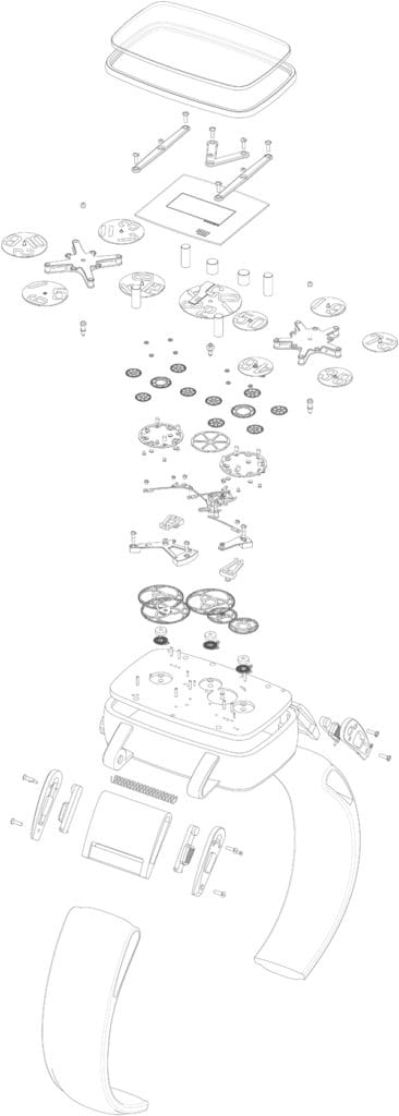 Le mouvement mécanique manuel se compose de 514 composants autour de 78 rubis, l’ensemble boîte/bracelet comportant 80 éléments. Ce que l’on peut apprécier sur les graphiques et coupes 3D détaillés de cet ensemble alliant design et excellence horlogère.
