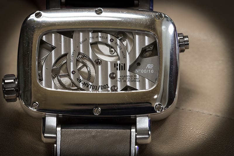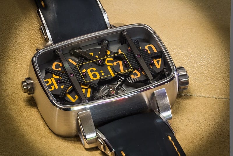 Afin de respecter ces objectifs, la boîte en or gris d’une épaisseur de 16 mm intègre un calibre maison, sur onze niveaux, qui repose sur trois ensembles de disques (4 pour les heures, 1 pour les dizaines de minutes, 5 pour les minutes), chacun de ces disques, mécaniquement solidaires, étant épais de 2/10èmes de mm.