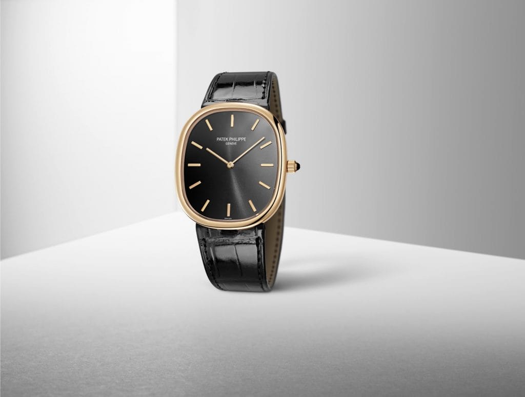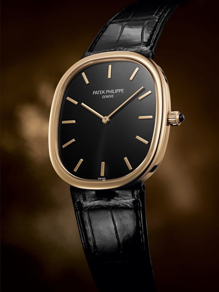Doté à l’origine d’un mouvement à remontage manuel, le boîtier au profil remarquablement mince de l’Ellipse d’Or fut le tout premier à accueillir en 1977 le fameux calibre 240 extra-plat à remontage automatique avec mini-rotor intégré. En 1993, Patek Philippe créa des modèles pour dames où les attaches du bracelet en cuir reproduisaient le design du boîtier en une élégante double ellipse. En 2005, la manufacture lança la référence 3738/100, un modèle hommes mariant les trois couleurs d’or à des teintes de cadrans très raffinées (Or Bleu® « soleil » pour l’or jaune, anthracite « soleil » pour l’or gris, brun chocolat « soleil » pour l’or rose). En 2008, Patek Philippe fêta les 40 ans de l’Ellipse d’Or en réintroduisant une version Jumbo (34 x 39,5 mm) proposée pour la première fois en platine, avec cadran Or Bleu® « soleil » (référence 5738P-001). A l’heure de son 50e anniversaire, la collection accueille deux nouvelles variations sur ce modèle de légende.