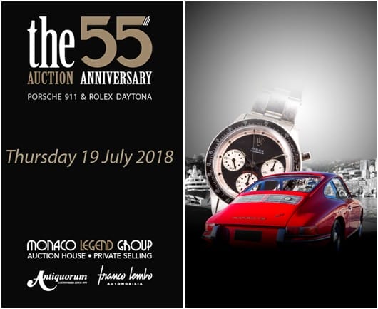 Le 19 juillet prochain, pour la première fois de son histoire, Antiquorum réalise une vente intégrant des voitures de collection tout en célébrant l’anniversaire d’une icône horlogère. En partenariat avec Monaco Legend Group, Porsche Distribution Paris et Franco Lembo, Antiquorum relève ainsi le défi de célébrer le 55ème anniversaire de la Porsche 911 et la Rolex Daytona.