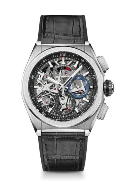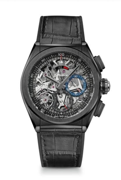 Montre automatique Defy El Primero 21 avec cadran ajouré et deux compteurs de couleurs différentes, boitier de 44 mm en céramique noire et bracelet en caoutchouc noir revêtu en cuir d’alligator.