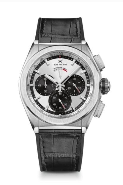 Montre automatique Defy El Primero 21 avec cadran soleillé argenté et trois compteurs de couleur noire, boitier de 44 mm en titane brossé et bracelet en caoutchouc noir revêtu en cuir d’alligator.