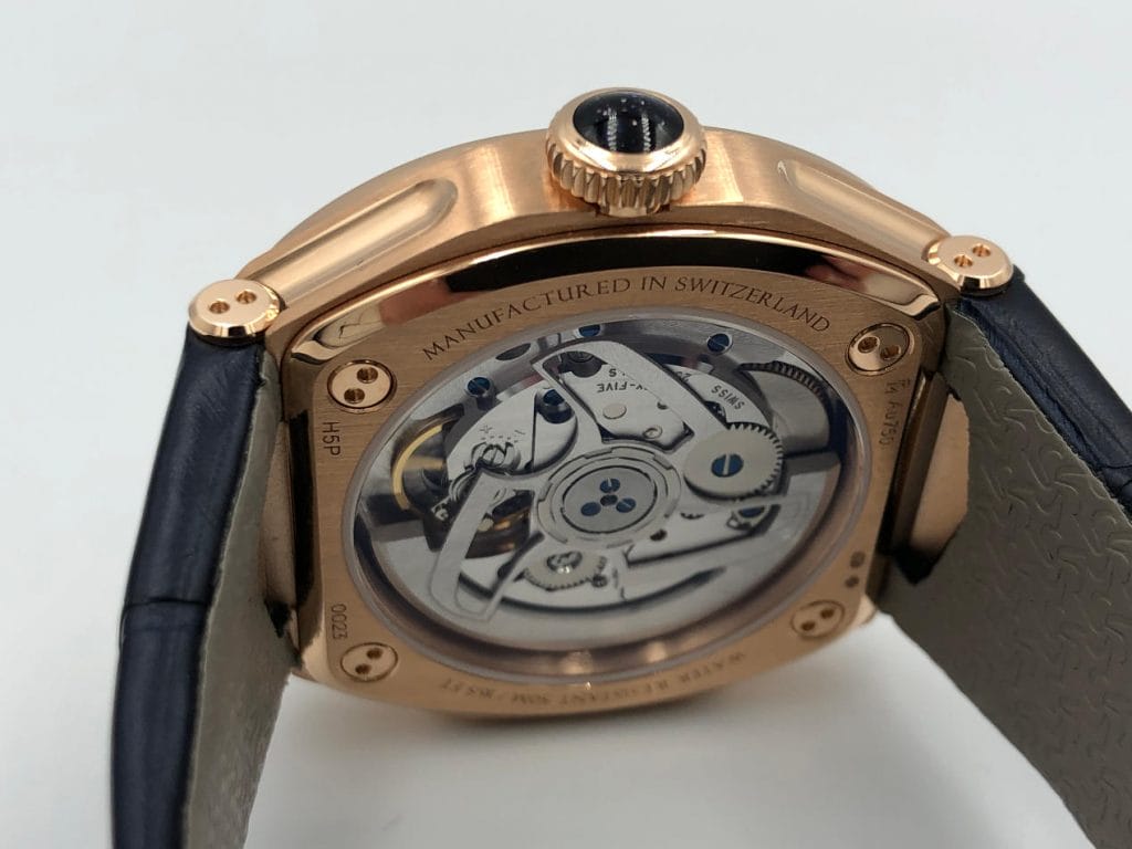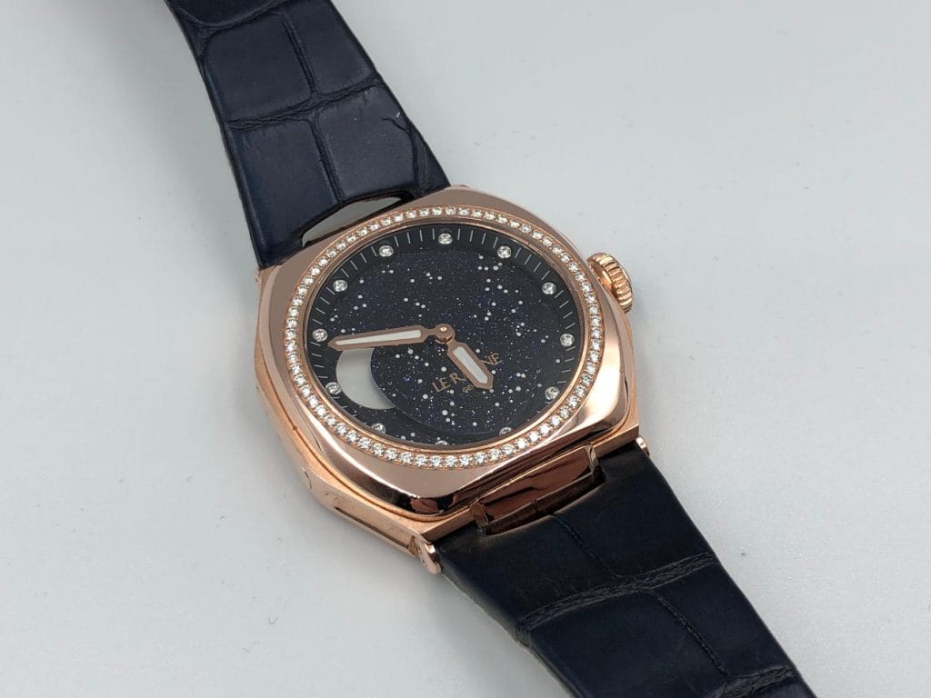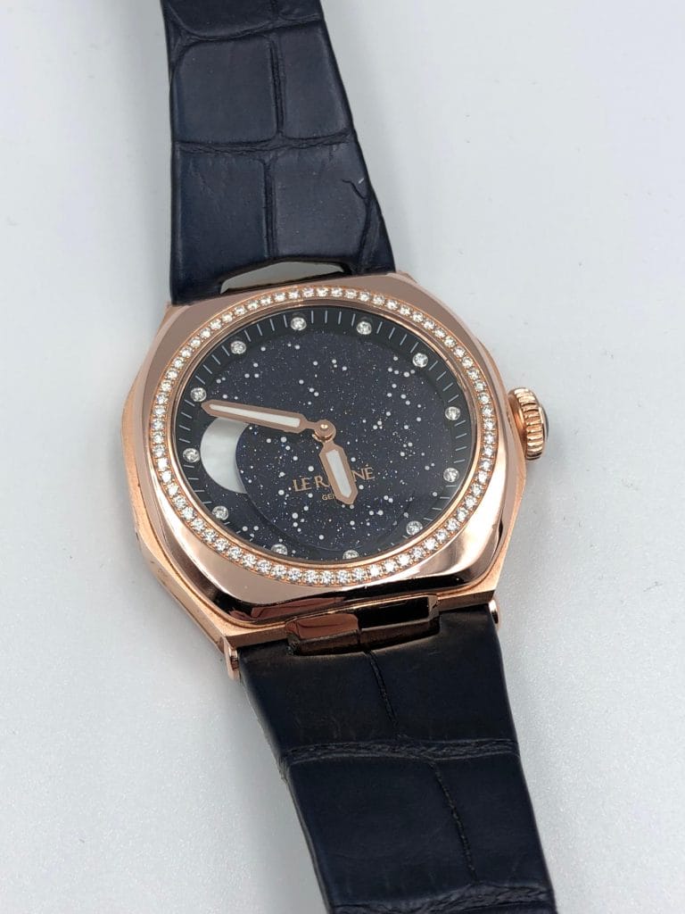 La collection Moön Phase de Lune Haute Joaillerie est dotée d’un mouvement automatique entièrement conçu et manufacturé en Suisse, réalisée en exclusivité pour Le Rhöne. Etanche à 30 mètres, elle offre une réserve de marche de 42 heures et un remontage bidirectionnel. Son bracelet en cuir en alligator bleu se marie avec la profondeur de la nuit étoilée.
