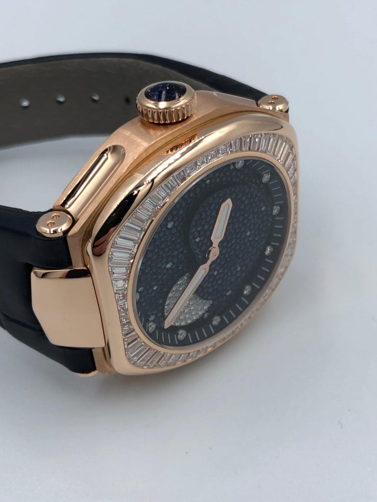 Forte de son succès, la collection Moön s’est agrandie cette année et accueille un nouveau modèle dans une version Haute Joaillerie, qui sera décliné selon cinq types de ciels. Véritable ode à la féminité, la boîte de 37 millimètres en or rose s’habille de 56 diamants taille baguette serties sur la lunette.