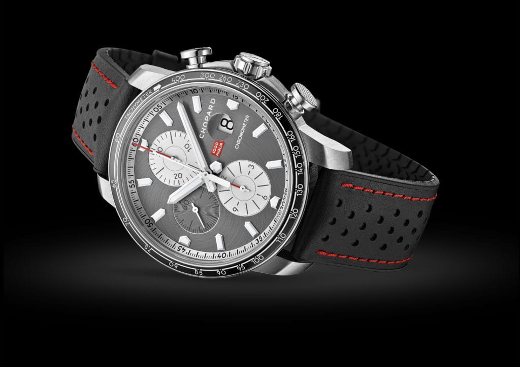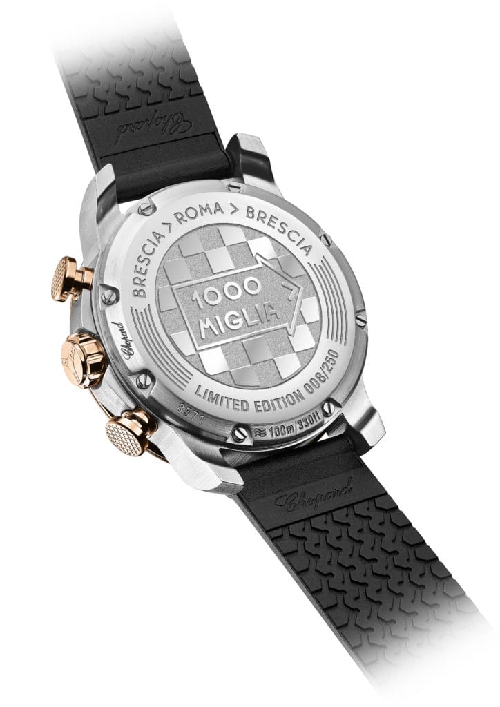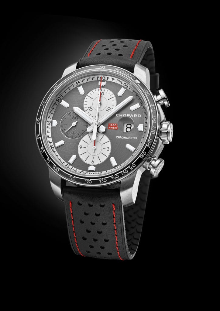 Sur la lunette, une échelle tachymétrique en céramique noire polie avec des marquages laqués blancs constitue l’outil parfait pour aider les concurrents à calculer leur vitesse moyenne pendant la 1000 Miglia. En effet, cette épreuve d’endurance repose sur des mesures précises, et c’est pourquoi Chopard, réputée pour la précision de ses garde-temps, constitue un partenaire privilégié pour la course.