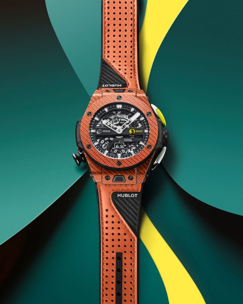 Nous avons conçu un module tout spécialement pour notre mouvement Unico, de sorte qu’à travers trois ouvertures, la montre précise au golfeur le trou sur lequel il se trouve, le nombre de coups engagés sur ce trou et le score cumulé sur le parcours. La Big Bang Unico Golf Orange Carbon écrit la suite de l’histoire, en insérant le mouvement automatique Hublot MHUB1580 révolutionnaire dans un boîtier en carbone orange, léger et acidulé.