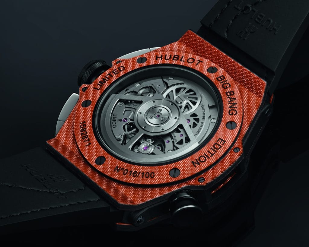 La Big Bang Unico Golf Orange Carbon dispose d’une réserve de marche de 72 heures, elle est livrée avec un bracelet en tissu orange high-tech équipé du système de remplacement One Click de Hublot, elle pèse moins de 100 grammes et propose une étanchéité à 600 mètres. Elle sera limitée à 100 exemplaires et est disponible dès aujourd’hui.