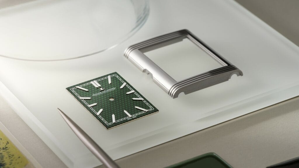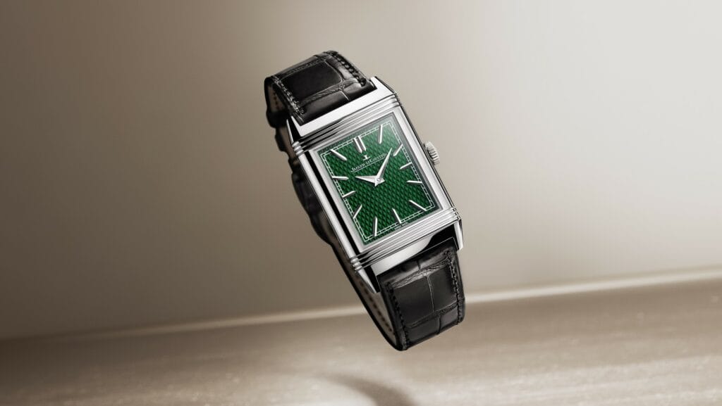La simplicité du cadran de la Reverso Tribute, avec ses index appliqués facettés et ses aiguilles Dauphines, met en exergue la beauté de son décor. En complément de la peinture miniature du fond de boîtier, ce cadran est orné d’un motif losange guilloché dont la texture est amplifiée par un émail Grand Feu translucide dans une riche nuance de vert.