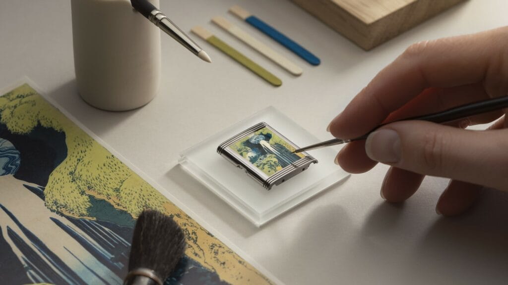 Pour capturer la puissance de l’œuvre originale d’Hokusai et reproduire fidèlement chaque détail sur une surface de seulement trois centimètres carrés (soit un peu plus d’un dixième de la taille de l’original), les maîtres artisans de Jaeger-LeCoultre ont dû non seulement miniaturiser et imiter parfaitement chaque détail de la composition, mais aussi créer l’illusion de la technique de gravure sur bois ; un effet spécifique entièrement différent de l’émaillage. Pour y parvenir, les émailleurs ont mis au point une technique spéciale qui reproduit l’effet bokashi caractéristique des couleurs subtilement nuancées et graduées des œuvres initialement imprimées sur papier, tout en capturant les bleus et les jaunes vifs qui sont une signature de l’œuvre d’Hokusai. Il s’agit d’un processus soigneusement orchestré en plusieurs étapes, qui représente 70 heures de travail étendues sur plusieurs semaines, dont un total de 12 à 15 cuissons distinctes à 800 degrés Celsius.