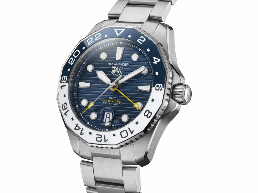 Outre sa forme affirmée et robuste, la nouvelle TAG Heuer Aquaracer Professional 300 GMT se distingue par sa palette de couleurs élégante : du bleu, du jaune et du blanc. Les designers de TAG Heuer ont sélectionné ces trois coloris décontractés pour représenter le ciel, le soleil, l’eau et les vagues qui s’échouent sur le rivage. Cette montre est le compagnon idéal des surfeurs et des plongeurs qui parcourent le monde à la recherche de la vague parfaite et des paysages sous-marins les plus spectaculaires.