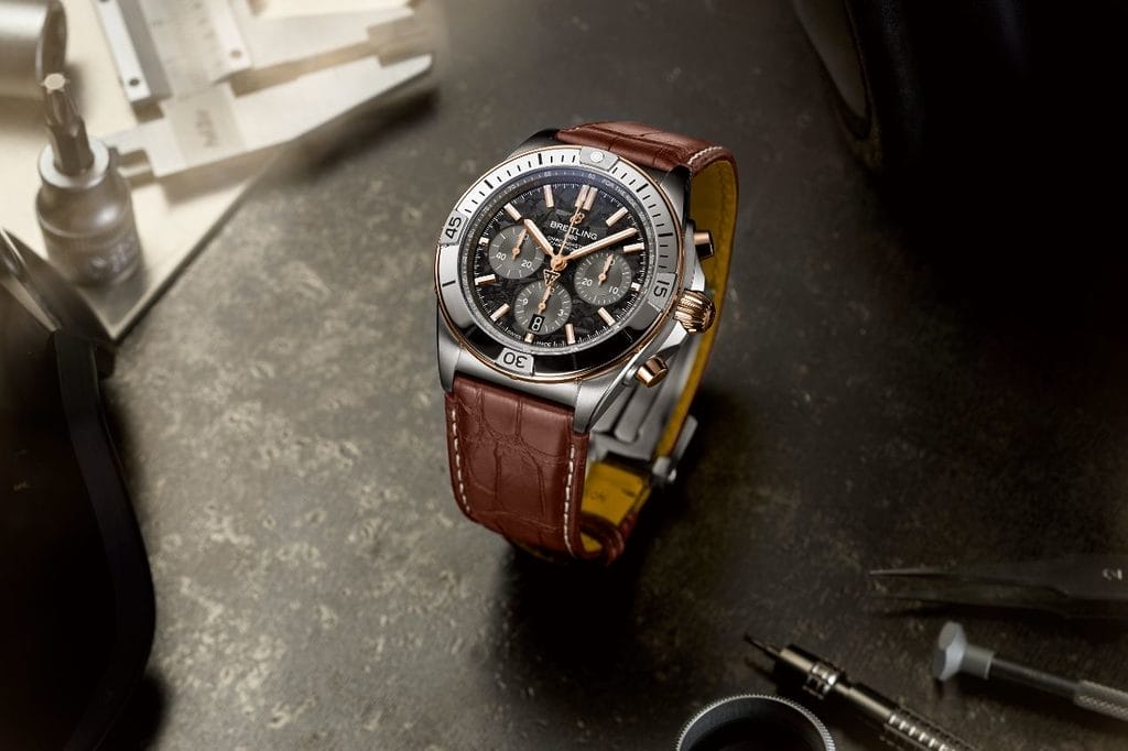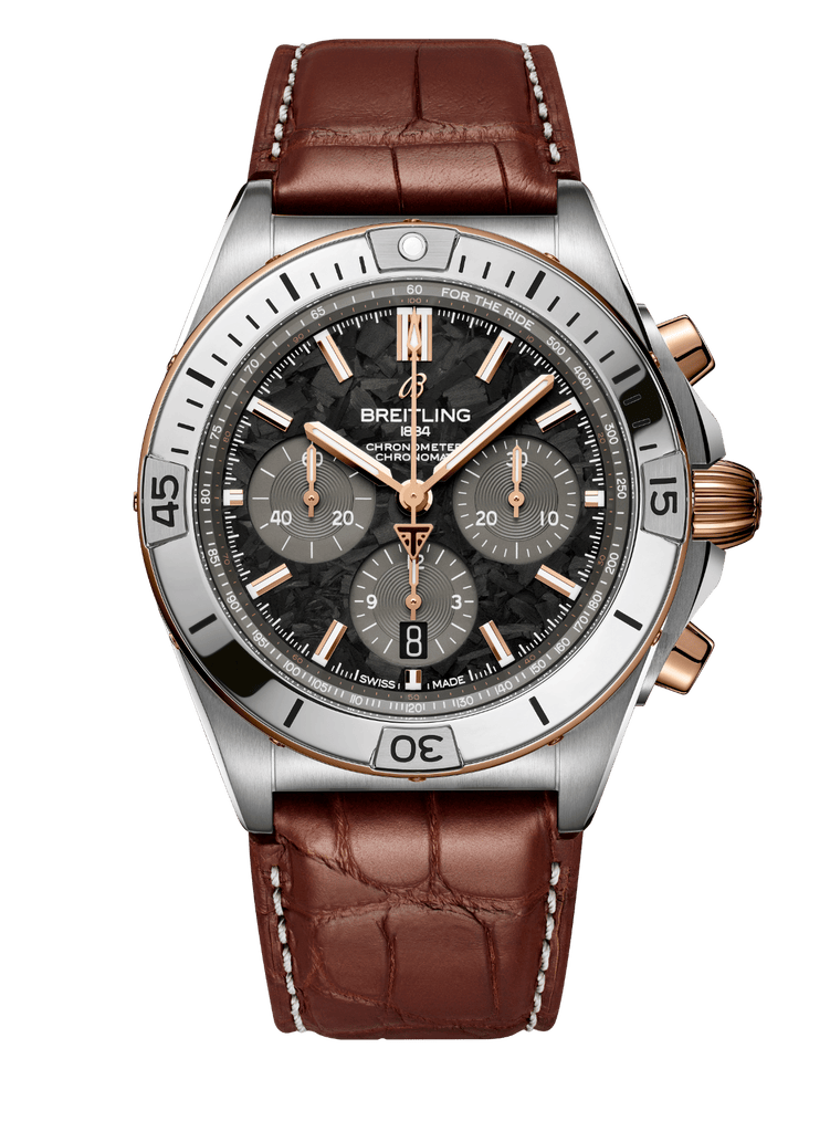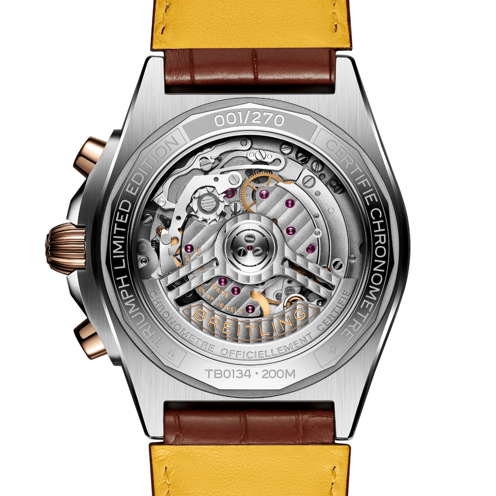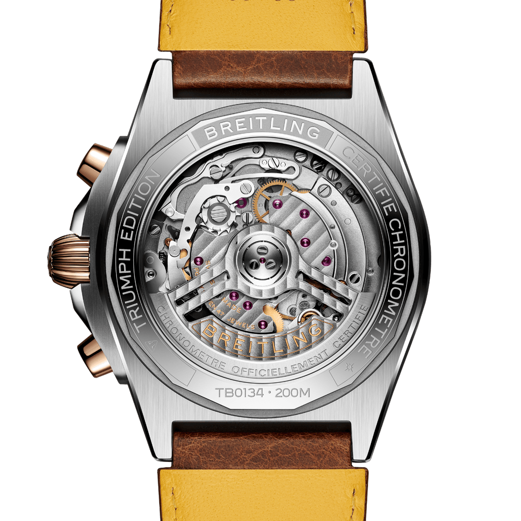 Les nouvelles éditions de la Chronomat B01 de Triumph, en titane et en or rouge 18 carats, font écho aux teintes sombres de la moto, tandis que ses détails dorés rendent hommage à la fameuse fourche Öhlins de la Speed Triple 1200 RR.