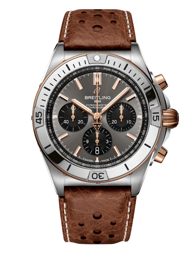 Pour leur troisième collaboration, l’horloger suisse de luxe et la marque de motos britannique présentent la montre Chronomat B01 42 Triumph, une fusion de titane et d’or rouge 18 carats ornée d’un cadran anthracite. Cette nouvelle version est parfaitement complétée par son bracelet en cuir marron, qui capture l’essence de la liberté sur la route.