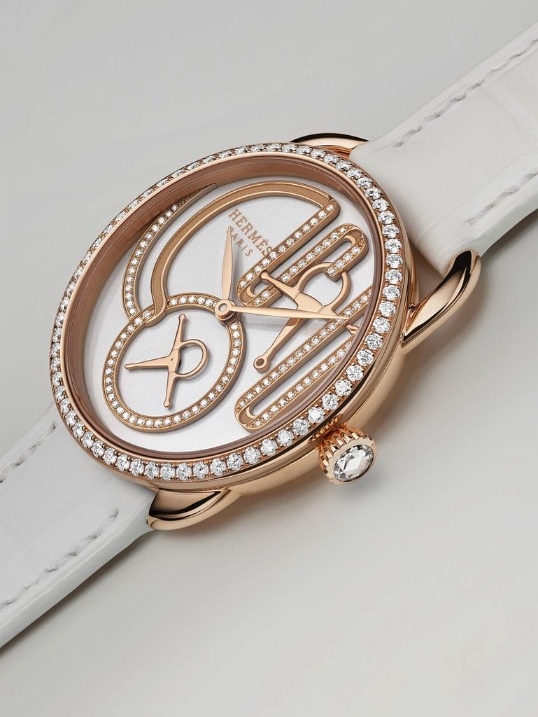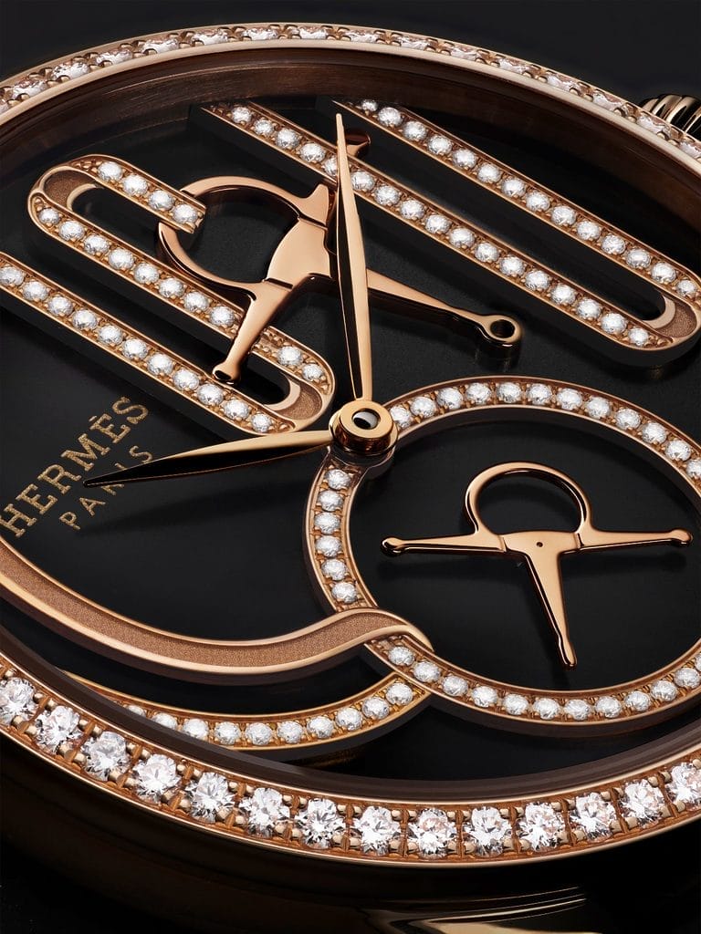 de 110 diamants, formant un décor graphique et délié à la fois. Animé par une petite seconde en forme de mors, l’ensemble prend vie au rythme du mouvement de manufacture Hermès H1912, dévoilé par le fond en saphir du boîtier. Réalisé au sein des ateliers Hermès Horloger, un bracelet en alligator lisse chantilly ou noir s’accorde à la couleur du cadran.