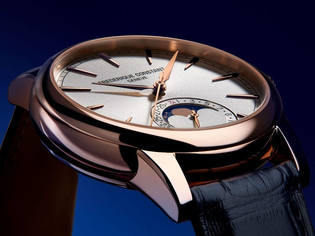 Pourtant, date et phase de Lune sont secrètement liées. Elles sont toutes deux filles de l’astronomie. Depuis bientôt trois siècles, les horlogers considèrent leur association comme naturelle et évidente. C’est aujourd’hui ce que vient célébrer Frederique Constant, convoquant pour l’occasion le répertoire traditionnel de la belle horlogerie, en hommage à ce patrimoine séculaire. Les deux complications sont donc intimement unies, lovées au sein d’un même compteur à 6h. Elles s’expriment sur un cadran argenté finement soleillé où se déploient, tout autour, de fins index de couleur or rose, en harmonie avec les aiguilles du même ton, individuellement polies à la main.