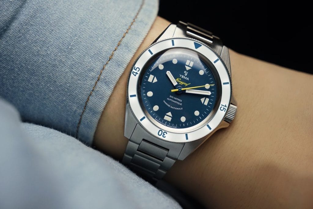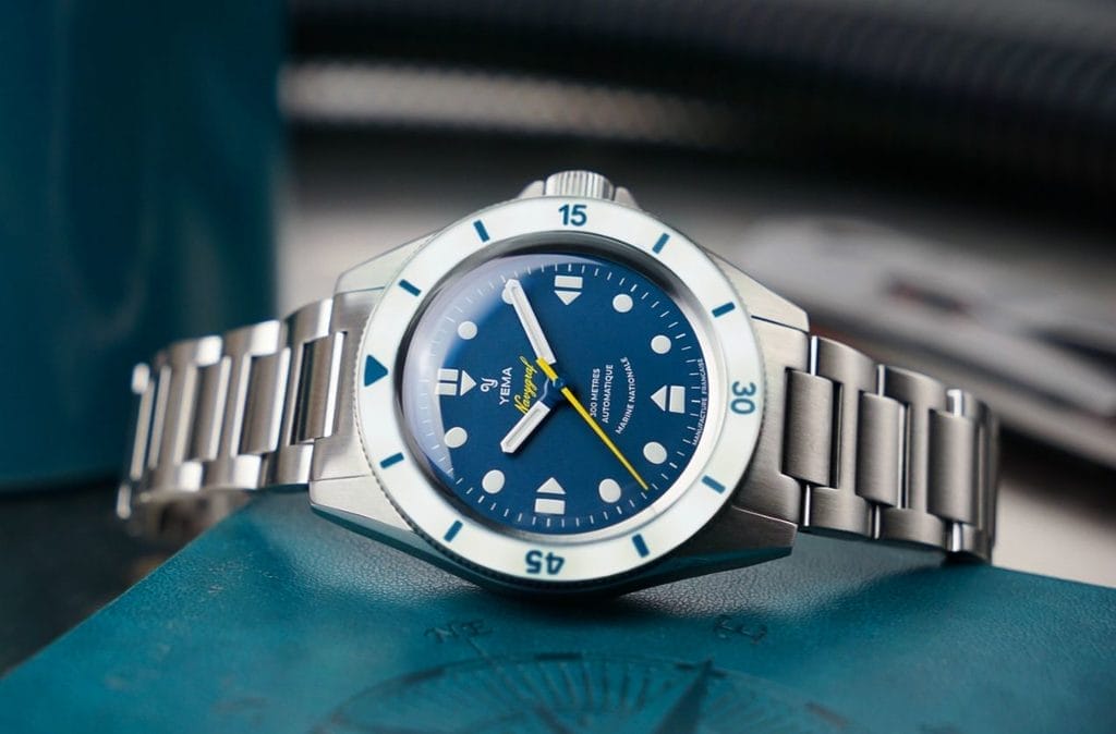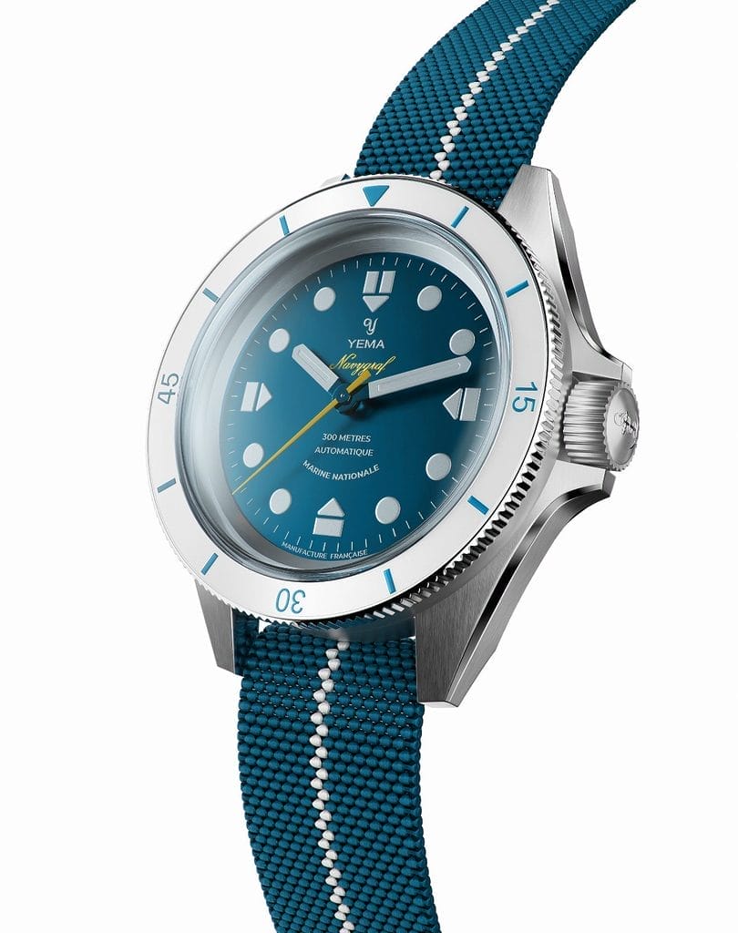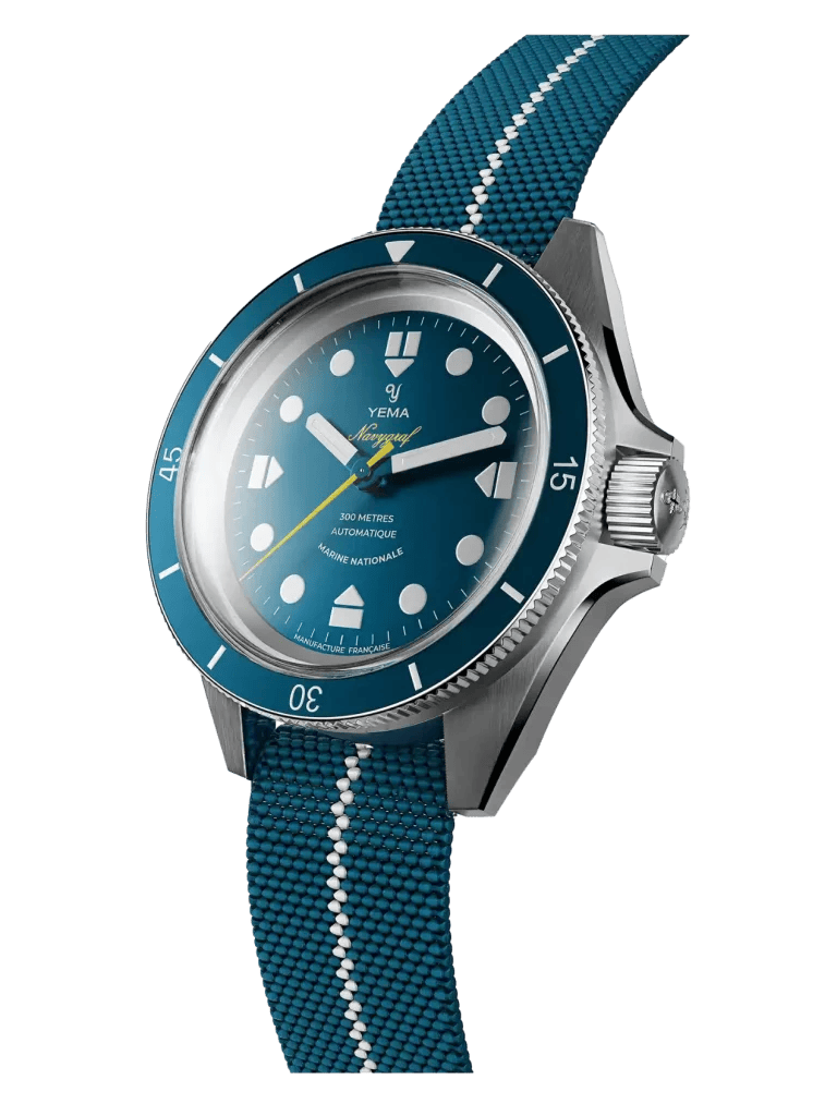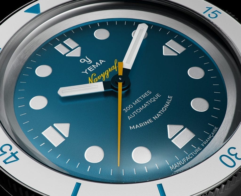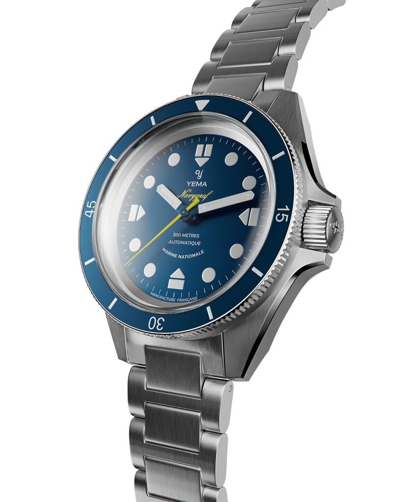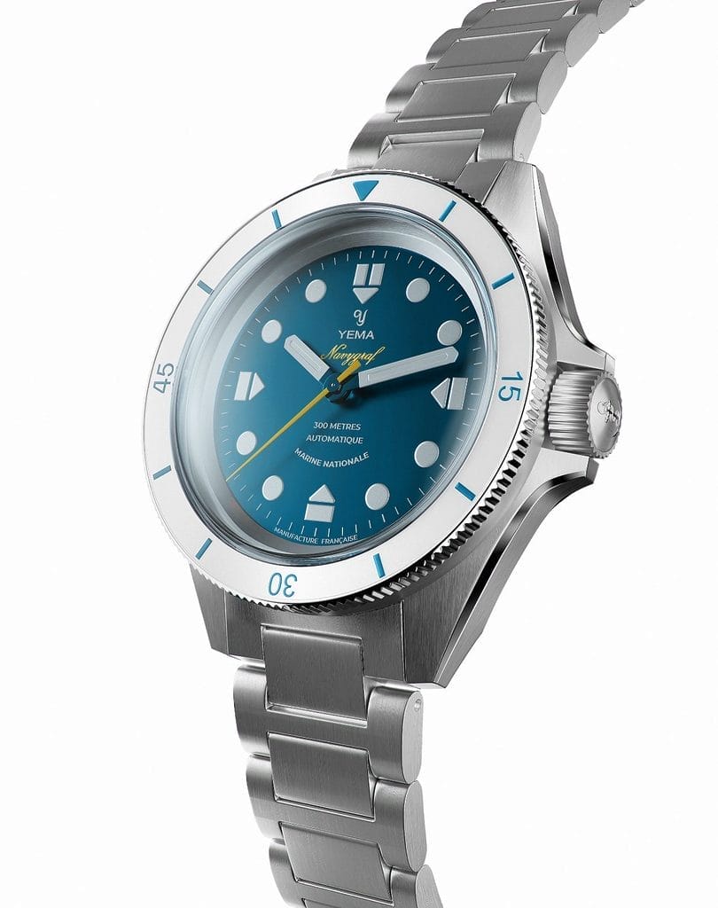 Les aiguilles heures et minutes reprennent la géométrie et la finition des modèles Navygraf des années 70’s. Le centre du canon ainsi que les extrémités de départ des aiguilles sont assortis à la couleur du cadran tandis que les aiguilles sont elles entièrement peintes en blanc pour un contraste fort. La trotteuse iconique Navygraf en jaune apporte une touche de couleur et du caractère à ce modèle historique.