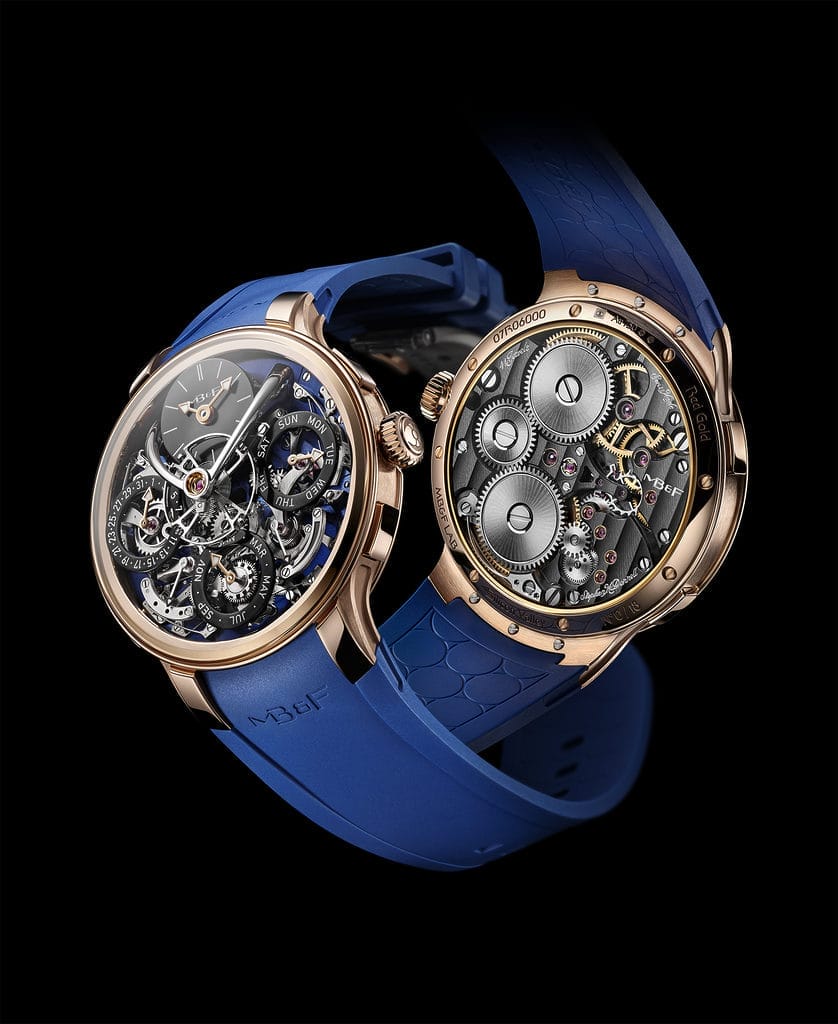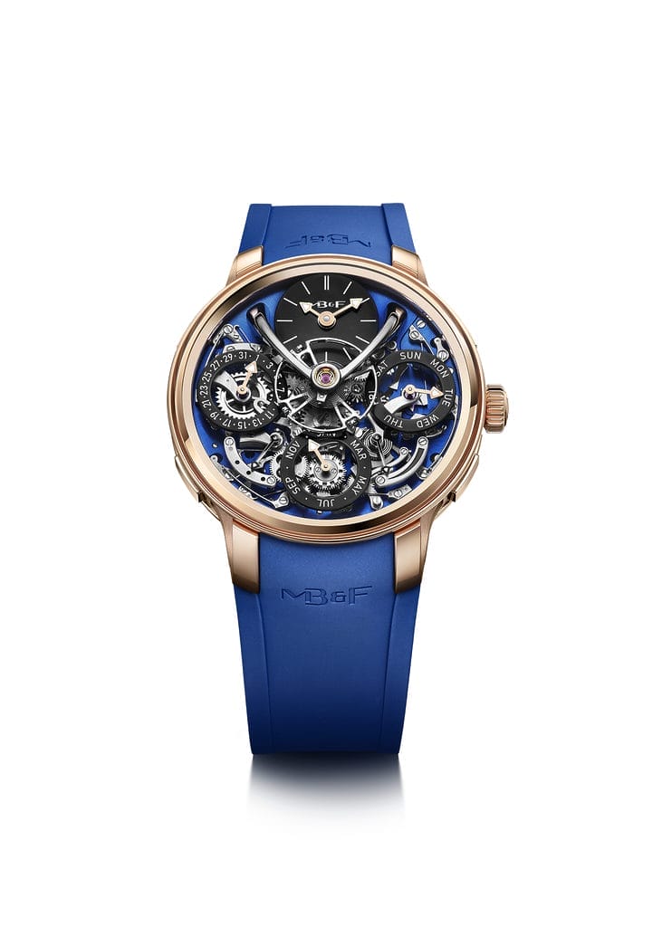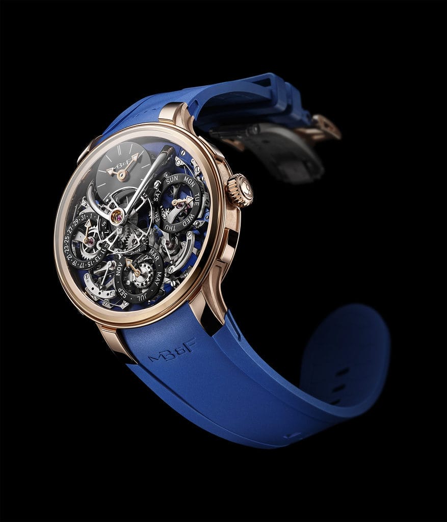 Lancée initialement en éditions limitées en zirconium, la LM Perpetual EVO a été suivie d’une version en titane avec cadran vert CVD, remplacée en 2024 par une variante au cadran bleu glacé. Pour célébrer l’ouverture du MB&F Lab en partenariat avec Stephen Silver dans la Silicon Valley, une édition limitée à 18 pièces en or rose 18 carats avec un cadran bleu océan voit le jour. Ces modèles, équipés d’un bracelet en caoutchouc intégré, offrent un confort inégalé.