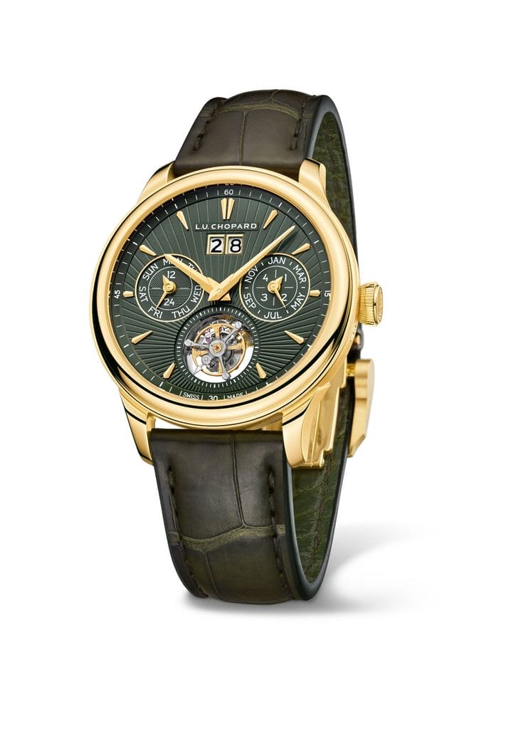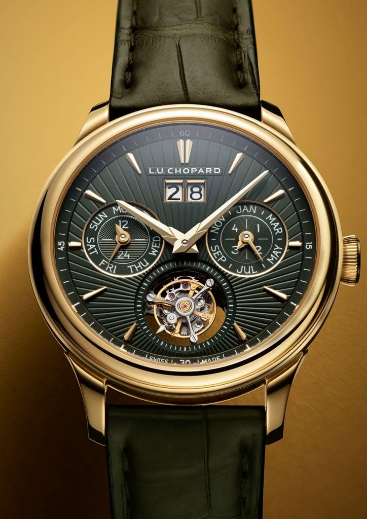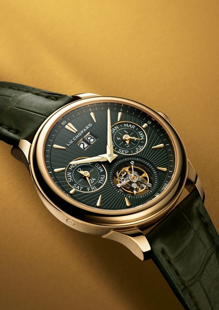 Le cadran guilloché à la main, d’un vert profond obtenu par traitement PVD, reflète l’héritage de la collection L.U.C. Son motif soleillé émane de l’ouverture du tourbillon volant à 6 heures, tandis que les compteurs azurés et les aiguilles en or jaune complètent un design raffiné et lisible.