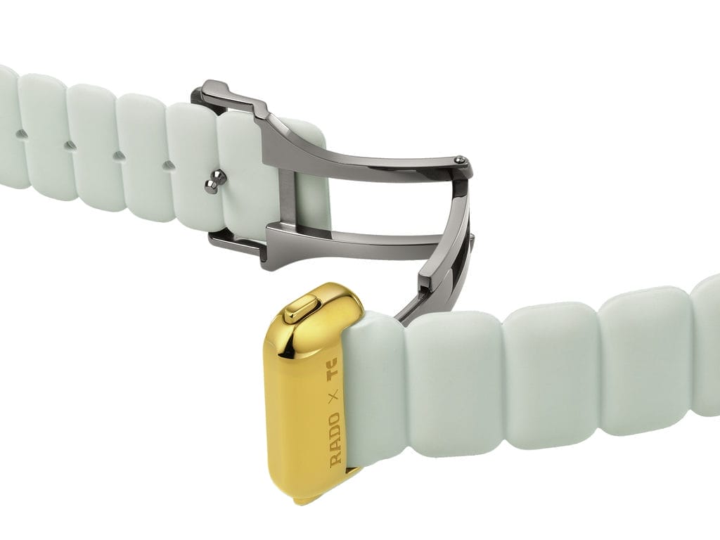 - Bracelet : Caoutchouc gris en forme de coussin, boucle déployante en acier inoxydable PVD gris foncé poli, fermoir et poussoirs en or jaune poli gravés « RADO x TC »
