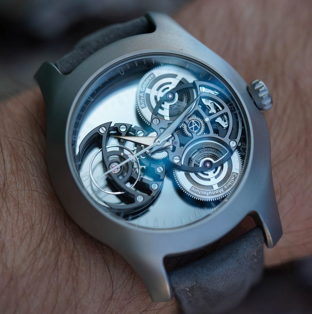 Un sablage aux microbilles de fonte et un anglage manuel des ponts de minuterie et de balancier viennent magnifier chaque détail. L’échappement, oscillant à une fréquence de 4 Hz, est mis en valeur comme une véritable star, suspendu dans le vide tel un élément sculptural.
