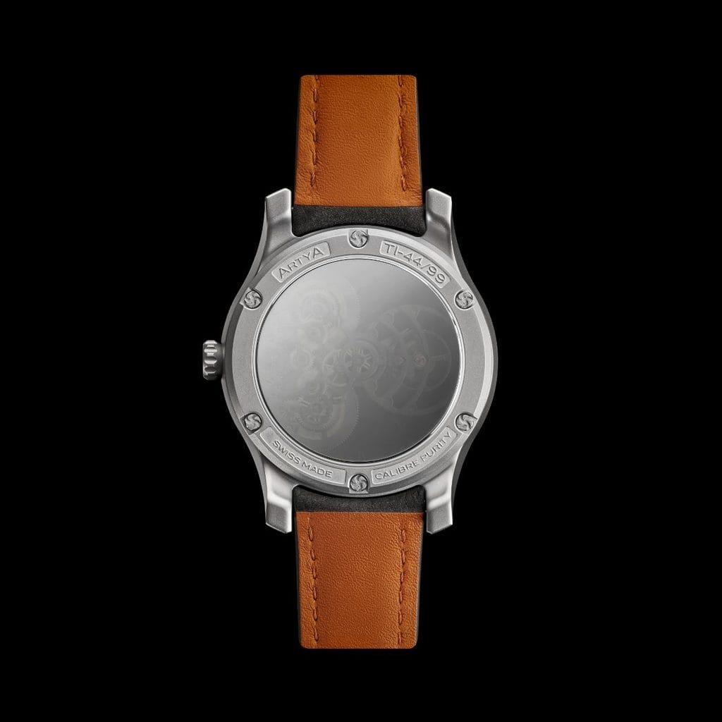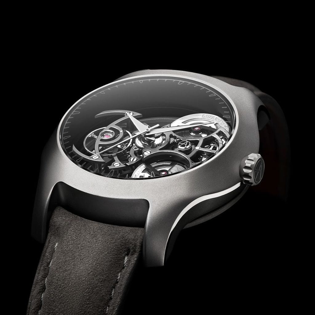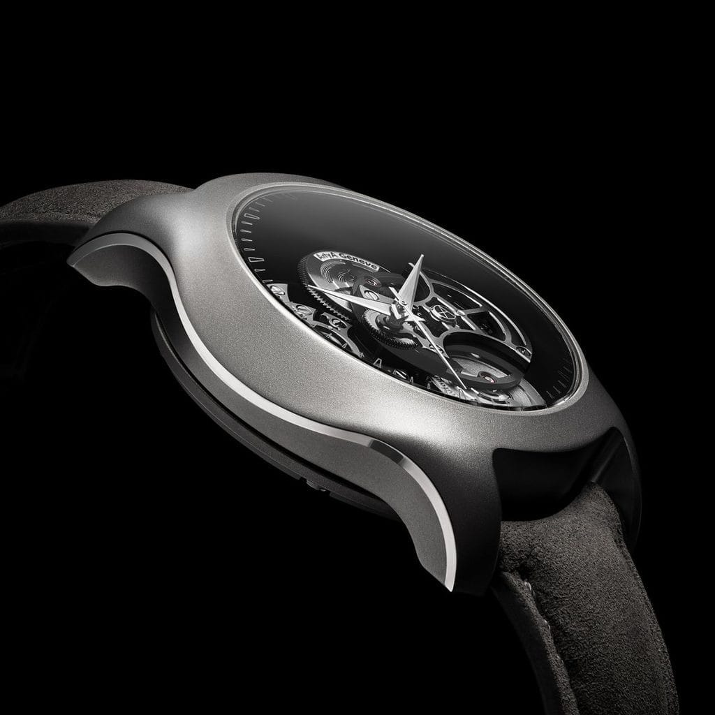 Le fond de la Wavy Titanium inaugure une innovation inédite en horlogerie : un miroir réfléchissant qui sublime la perspective du mouvement tout en empêchant la vue de la peau à travers la structure squelettée.