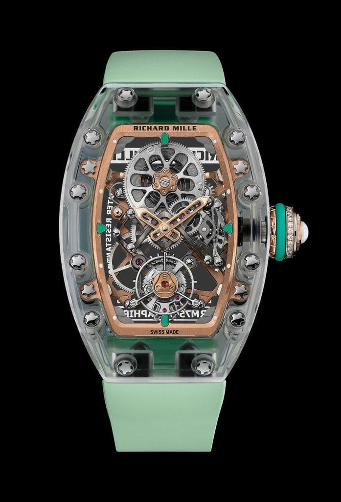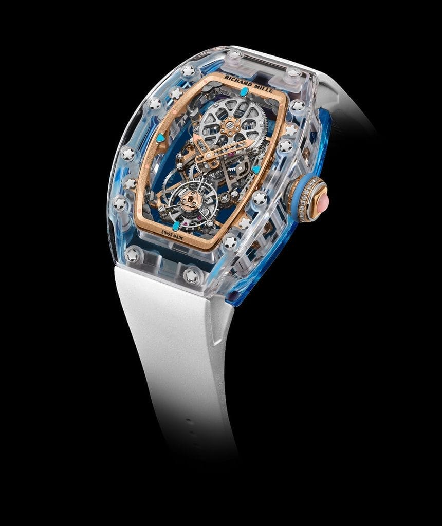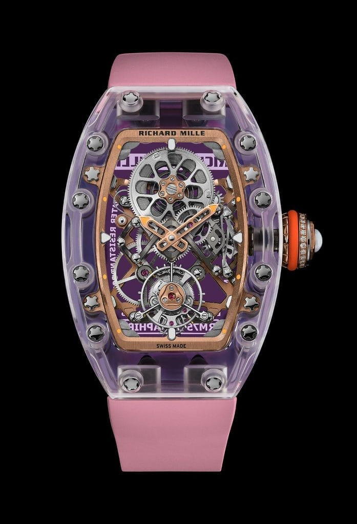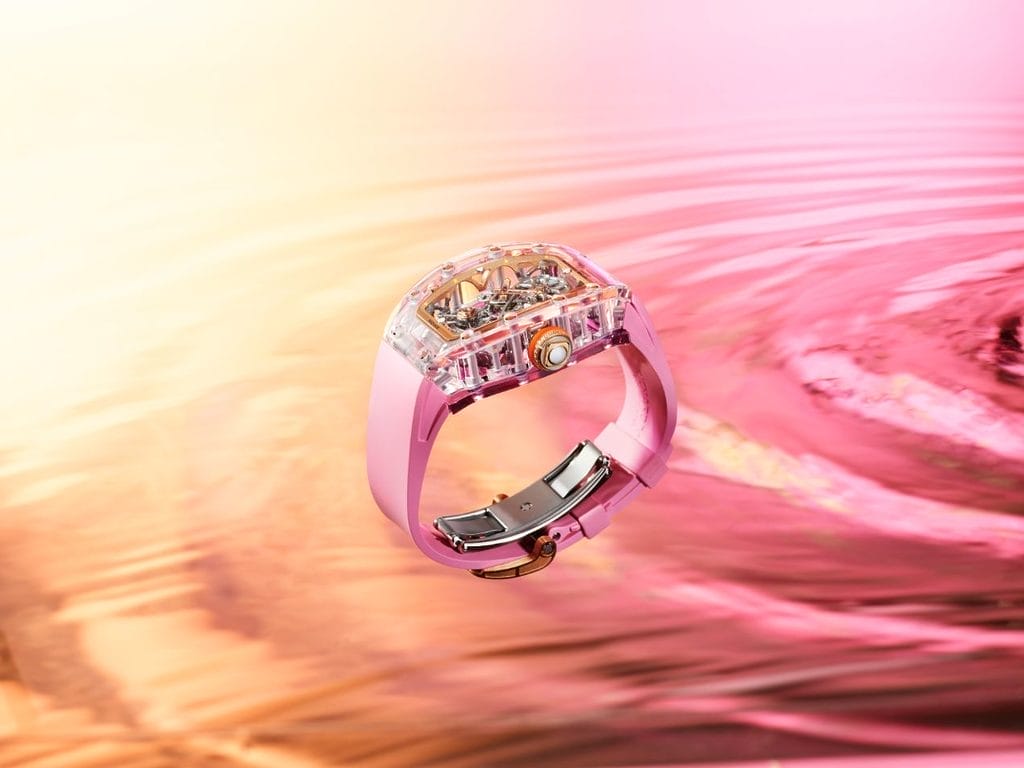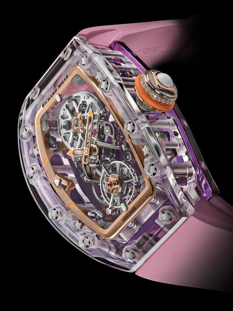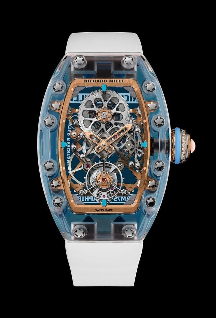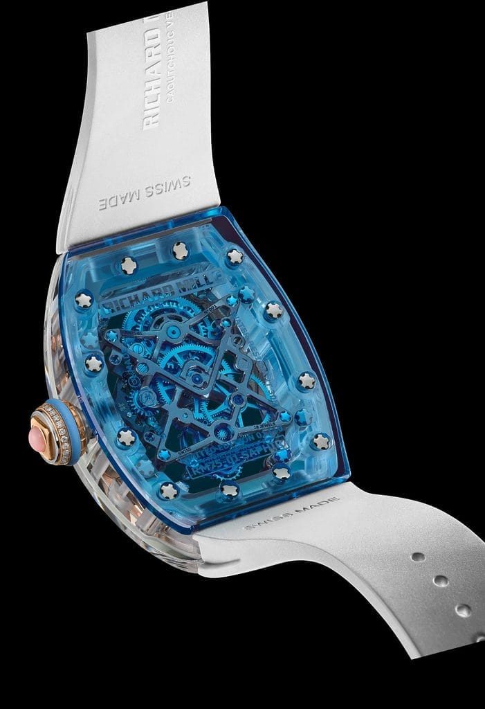 Déclinée en trois éditions ultra limitées — deux séries de 10 exemplaires en saphir transparent et saphir coloré, et une série de 15 pièces en saphir incolore — la RM 75-01 évoque autant de paysages oniriques. Le modèle en saphir transparent, rehaussé d’un bracelet vert d’eau, fait écho aux lagons cristallins. Les variantes en saphir teinté plongent plus loin encore : la teinte lilas rappelle la lumière rasante des mers du Sud au crépuscule, tandis que le bleu profond évoque les mystères des abysses.