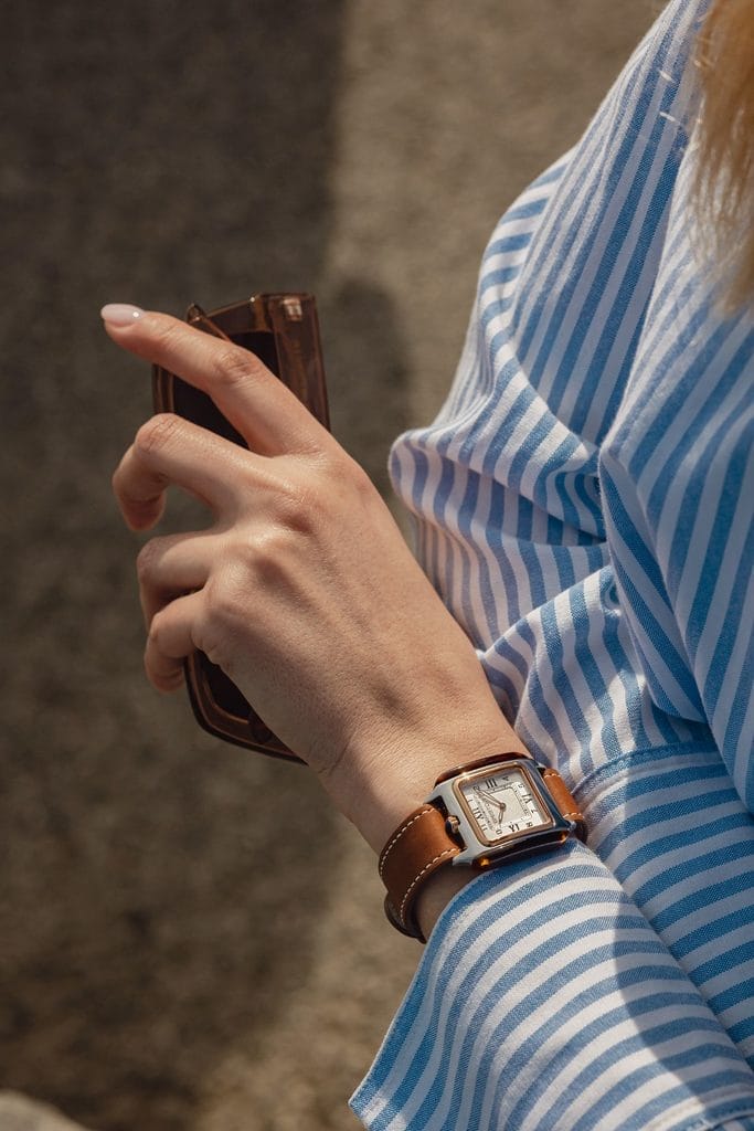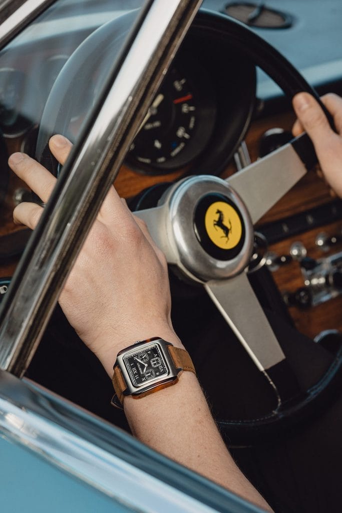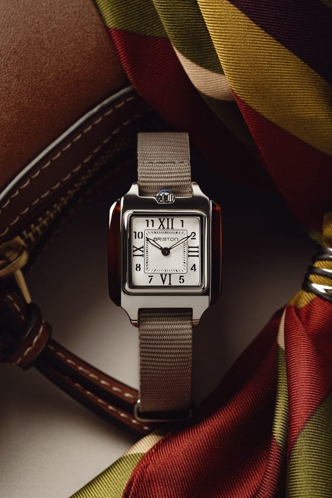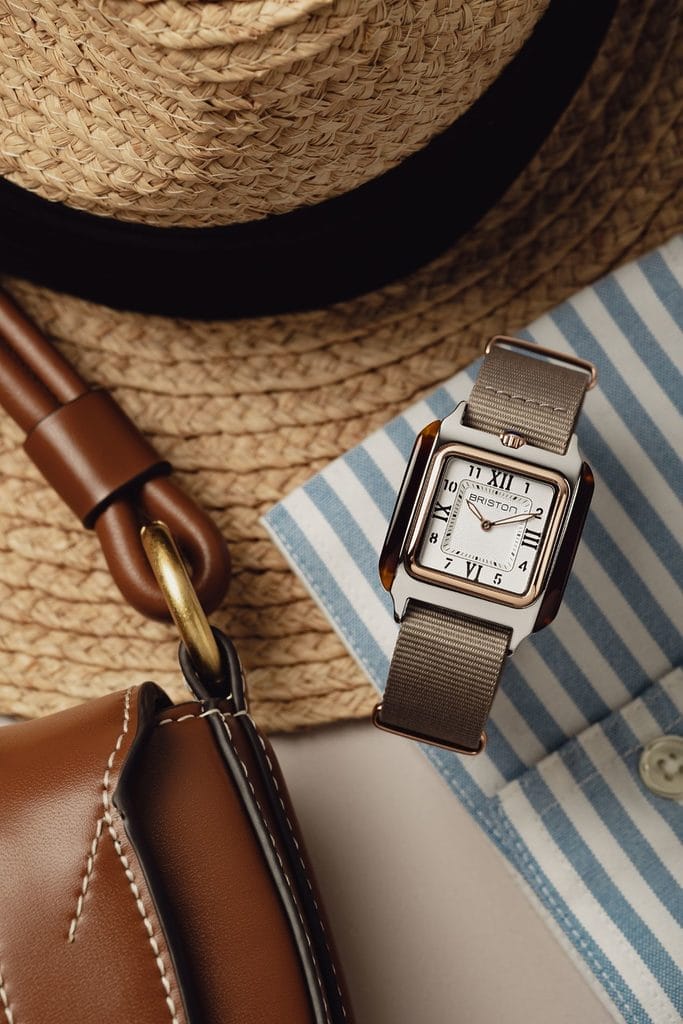 Le boîtier carré, inédit dans l’univers BRISTON, rend hommage aux lignes géométriques de l’Art déco. Réalisé en acier inoxydable 316L et flanqué d’acétate façon écaille de tortue poli à la main, il donne à la montre une silhouette équilibrée entre modernité et nostalgie. Le choix de l’acétate — matériau signature de la marque — renforce cette singularité visuelle, tout en assurant un confort optimal.