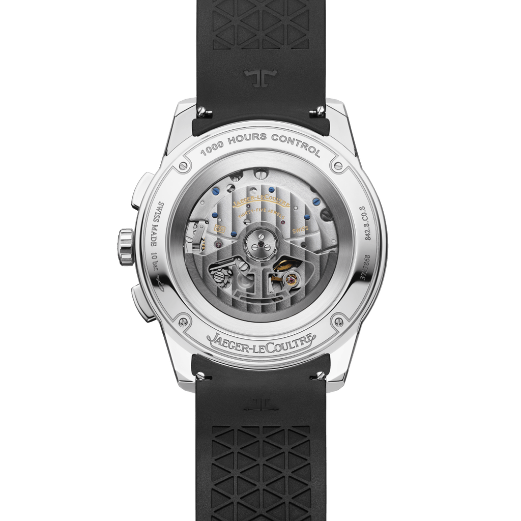 Le fond en verre saphir de la montre dévoile le Calibre automatique 761, symbole du savoir-faire technique et esthétique de Jaeger-LeCoultre. Doté de deux barillets, ce mouvement chronographe intégré bénéficie d’un système à roue à colonnes avec embrayage vertical, et offre une autonomie de 65 heures. Il présente des finitions soignées, avec vis bleuies, décorations Côtes de Genève et rotor ajouré orné du logo de la Maison. Ce calibre est intégralement conçu, fabriqué et assemblé dans les ateliers de la Manufacture, située au cœur de la Vallée de Joux.