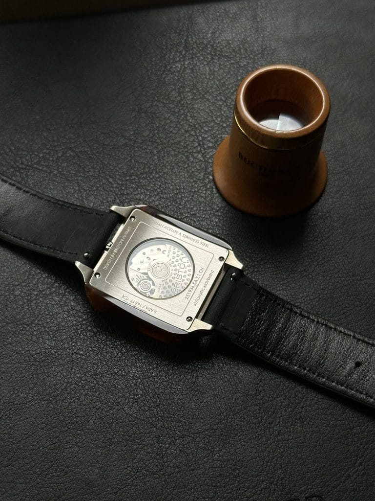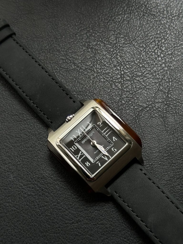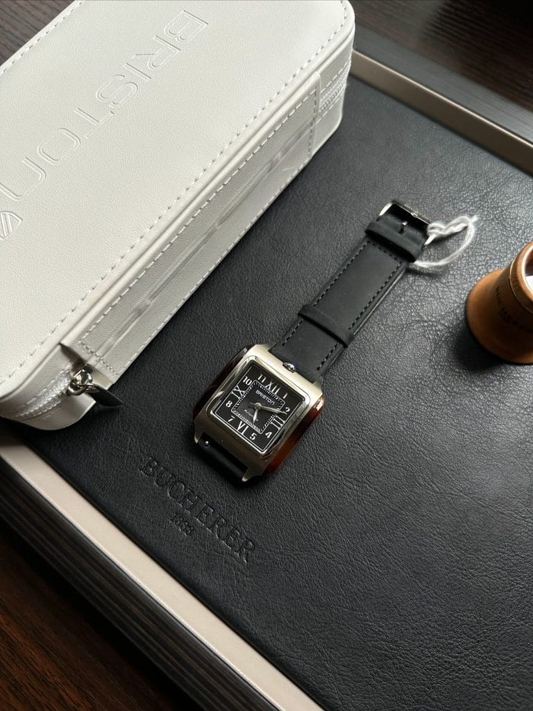 Dès le premier regard, la Streamliner Kennedy séduit par sa forme carrée de 36 mm, à la fois rétro et contemporaine. Un format audacieux, mais parfaitement maîtrisé, qui évoque les codes esthétiques du design Art Déco et du mouvement Streamline des années 1930. Le boîtier mêle acier poli-brossé et flancs en acétate façon écaille de tortue, une signature chère à Briston, qui confère à la montre une identité à part. Cette combinaison de matériaux offre une lecture visuelle riche en textures, à la fois chaleureuse et distinguée.