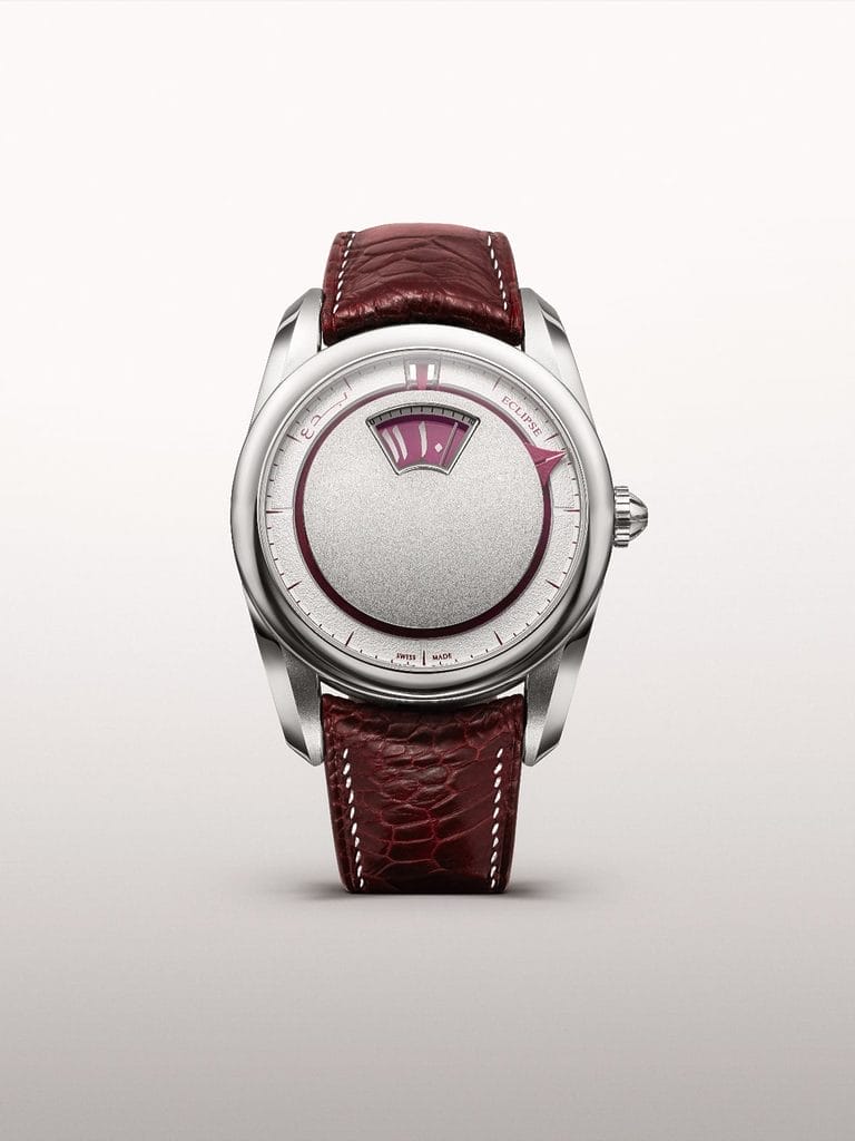 Cette teinte se retrouve également sur le fond du boîtier de l’Eclipse, avec un nouveau rotor bordeaux.