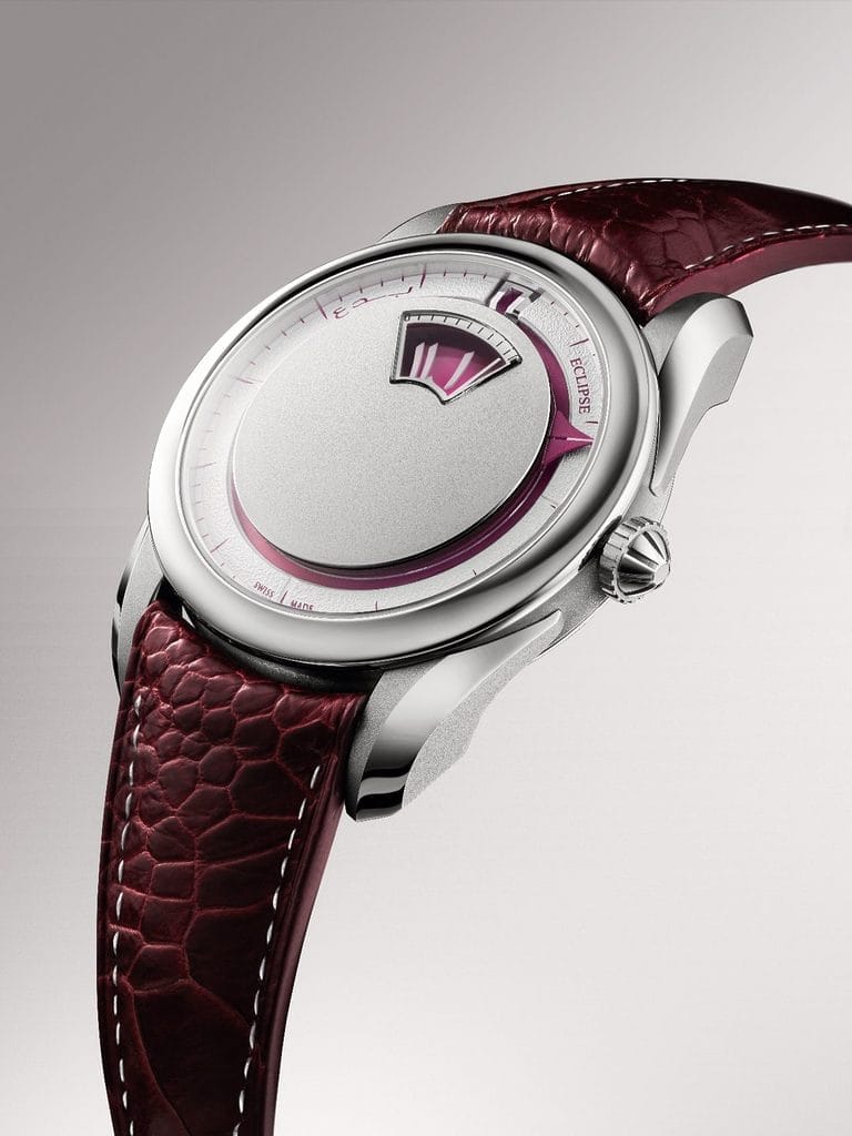 Inspirée par le rare phénomène naturel dont elle tire son nom, l’Eclipse réinvente la lecture du temps à travers une approche minimaliste et saisissante. Enfermée dans un boîtier en acier inoxydable de 37 mm, une « protection céleste » dissimule la majeure partie du cadran, ne révélant que l’essentiel : une ouverture circulaire pour les heures, un indicateur de minutes flottant et un discret compteur de 10 secondes.