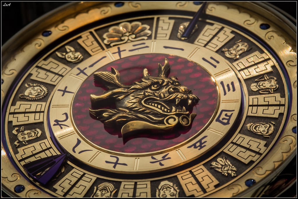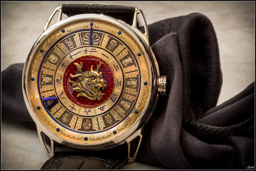 De Bethune va ainsi présenter 4 ensembles complets des 12 animaux zodiacaux sous l’appellation DB25 Imperial Fountain, chacun d’une couleur spécifique. C’est l’ensemble « Rouge » qui était offert à la curiosité des amateurs à Baselworld. Ici le « Dragon » de l’Ensemble Rouge :