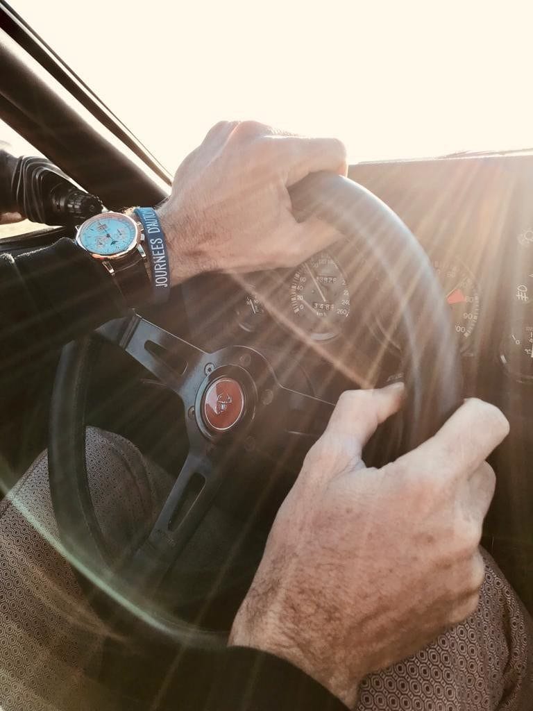 On peut y voir aussi quelques habitués tel Tristan Auer, devenu Ambassadeur de la marque Lange cette année, lui-même collectionneur et participant au rallye dans sa Lancia 037. Tristan Auer, designer, esthète et amateur de belle horlogerie portait un Datograph Perpétuel en or rose. Pièce qu’il affectionne tout particulièrement.