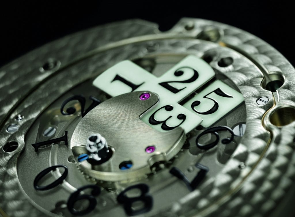 Mais la véritable avant-garde est l’outsize date lumineuse. Composée de deux éléments d’affichages séparés, l’outsize-date est pensée pour briller immédiatement après la séquence de commutation de minuit. Cela est rendu possible avec un dix transversal lumineux et un disc des unités imprimé en noir sur un verre transparent qui pivote sous l’arrière plan lumineux. Les deux éléments doivent pouvoir se recharger pendant la journée quand ils sont positionnés sous le cadran. Cela fonctionne même pendant la journée grâce à l’écran semi-transparent, qui dote la montre d’un charme esthétique inimitable. Exposé à la lumière, le mécanisme est clairement visible. Le changement de l’affichage de la date à minuit peut alors être observé en détail.