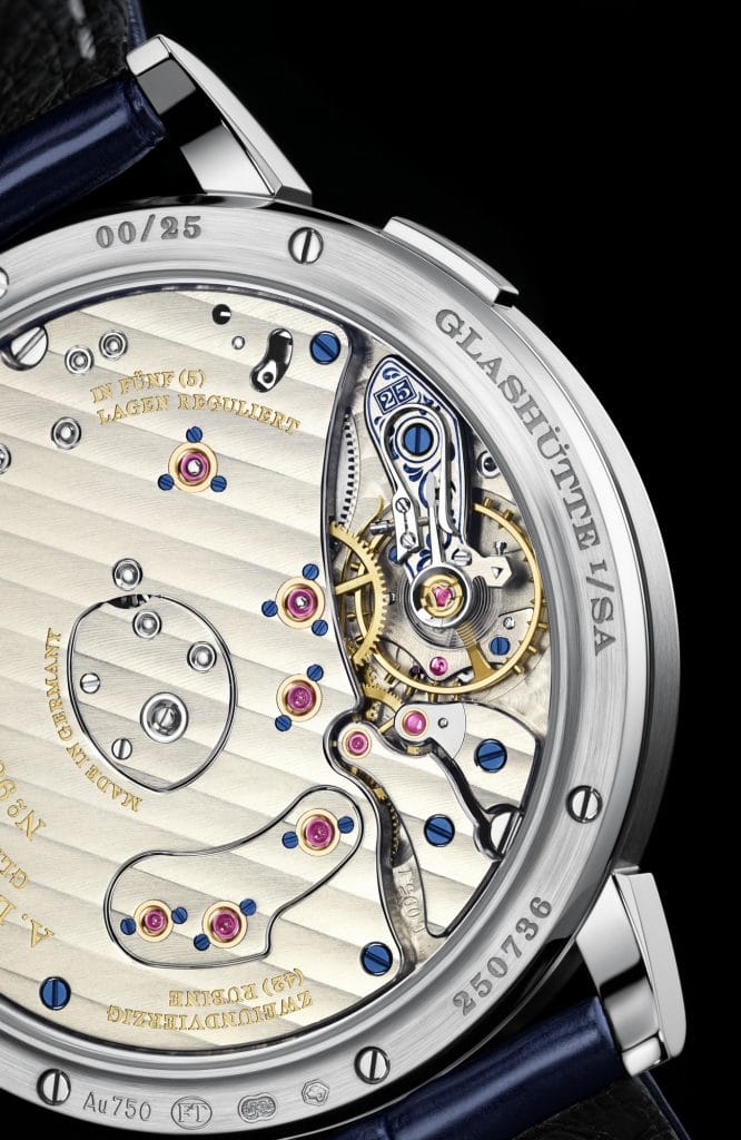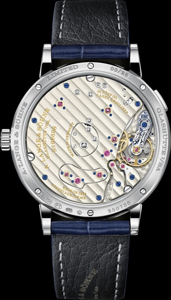 Le mouvement, visible à travers le fond de boîte en verre saphir, renferme 397 composants entièrement finis à la main. Parmi les 42 coussinets, sept sont ornés d’un poli brillant et sertis dans des chatons en or maintenus par des vis bleuies. Le système oscillant, composé d’un balancier à vis classique et d’un spiral Lange, est placé sous un coq de barillet gravé à la main. Dans son motif bleu, on peut voir la signature discrète de la collection « 25th Anniversary » : le nombre « 25 » encadré, qui fait écho à la grande date Lange.