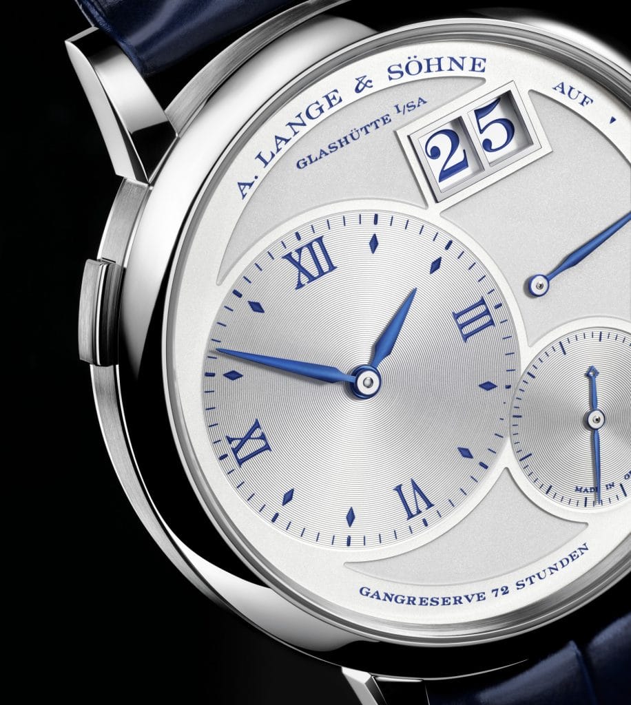La GRANDE LANGE 1 est plus large que la classique LANGE 1 de 2,5 millimètres. Quand elles sont placées côte à côte, on voit très bien que les proportions du second modèle sont supérieures à celles de l’original. À l’occasion du 25ème anniversaire de la LANGE 1, la GRANDE LANGE 1 est elle aussi désormais disponible dans une édition limitée à 25 exemplaires, en or gris et aux accents bleutés.