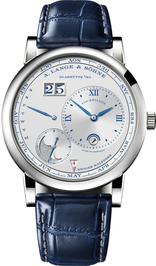 Avec une élégance discrète, la LANGE 1 TOURBILLON QUANTIÈME PERPÉTUEL intègre un quantième perpétuel et un tourbillon au design incomparable de la LANGE 1. A l’occasion de son 25 ème anniversaire, Lange propose la plus grande complication famille de montres dans une édition limitée à 25 exemplaires en or gris et aux aiguilles en acier bleui.