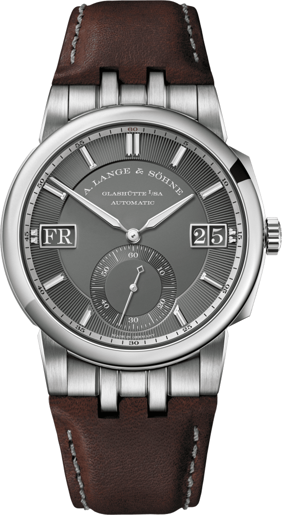 Le deuxième modèle de cette nouvelle ligne combine un boîtier en or gris de 40,5 millimètres et un cadran gris. Sur ce fond sombre, des aiguilles en or gris et des appliques bâtons dentelées assurent une bonne lisibilité. Les chiffres de la grande date et les lettres du grand indicateur du jour de la semaine sont en blanc sur fond gris. Avec une hauteur de 2,4 millimètres, ils se déchiffrent facilement, même dans des conditions de faible luminosité. Tout comme les aiguilles des heures et des minutes, les index des heures sont luminescents. La structure rainurée, gravée sous les appliques des heures et l’échelle de la petite seconde, accentue l’impact esthétique du cadran, tandis que l’éclat mat des surfaces intérieures des cadrans, principal et secondaire, offre un contraste saisissant. Le 60 rouge apporte quant à lui une touche de couleur discrète sur le rehaut, biseauté, de couleur argentée et imprimé d’une minuterie.