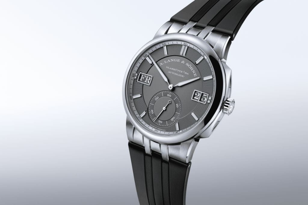 Les poussoirs en forme de coins, disposés de part et d’autre de la couronne, servent à corriger la date et le jour de la semaine et dessinent la silhouette marquante du boîtier en or gris à trois parties. L’alternance entre surfaces brossé mat et biseaux polis caractérise les finitions du boîtier ainsi que des cornes du bracelet. Le bracelet intégré est proposé, au choix, en cuir cousu main ou en caoutchouc noir. Enfin, les aérations pratiquées sur la face intérieure assurent un grand confort au poignet.