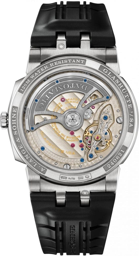 Dans le respect de la philosophie Lange, tous les composants du mouvement assemblé deux fois ont fait l’objet d’un travail de finition à la main sophistiqué. Le fond de boîte en verre saphir dévoile de nombreux détails artisanaux. Parmi ceux-ci, on retrouve notamment la platine en maillechort ornée de côtes de Glashütte, le pont de balancier gravé d’un motif ondulé et le chaton en or vissé sur la roue d’ancre.