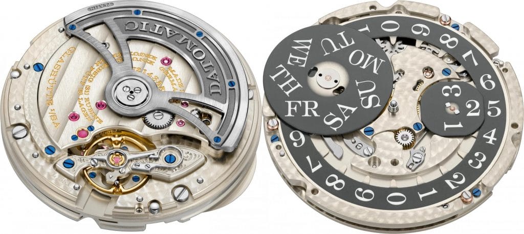 Calibre L155.1 DATOMATIC® de manufacture Lange ; remontage automatique, fabriqué selon les plus hauts critères de qualité Lange, décoré et assemblé à la main ; réglage de précision en cinq positions ; rotor central à remontage unidirectionnel avec masse centrifuge en platine ; pont de balancier gravé à la main.