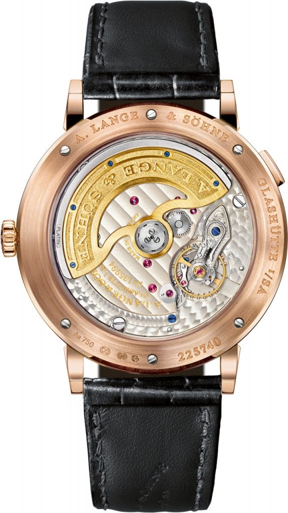 | Mouvement | Calibre L086.5 de manufacture Lange ; remontage automatique, fabriqué selon les plus hauts critères de qualité Lange, décoré et assemblé à la main ; réglage de précision en cinq positions ; platines en maillechort non traité ; coq de balancier gravé à la main | ||