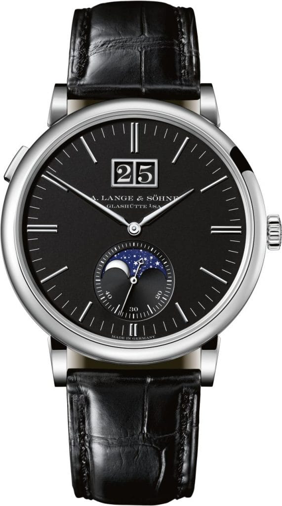 Fonctionnalité, simplicité et clarté – la SAXONIA PHASES DE LUNE, présentée en 2016, réunit tous les critères d’une montre-bracelet que l’on a plaisir à porter. Le cadran en argent massif galvanisé noir confère une tout autre apparence au garde-temps doté des deux complications classiques. L’effet de contraste est en outre renforcé par le bracelet en cuir d’alligator cousu main, également dans la même teinte.