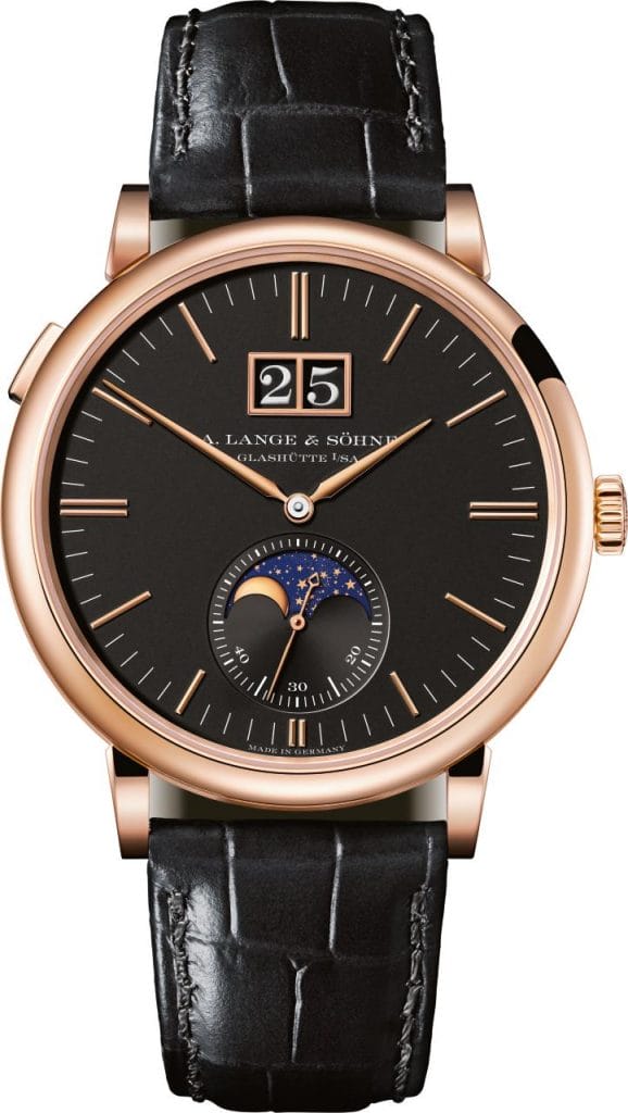 Fonctionnalité, simplicité et clarté – la SAXONIA PHASES DE LUNE, présentée en 2016, réunit tous les critères d’une montre-bracelet que l’on a plaisir à porter. Le cadran en argent massif galvanisé noir confère une tout autre apparence au garde-temps doté des deux complications classiques. L’effet de contraste est en outre renforcé par le bracelet en cuir d’alligator cousu main, également dans la même teinte.