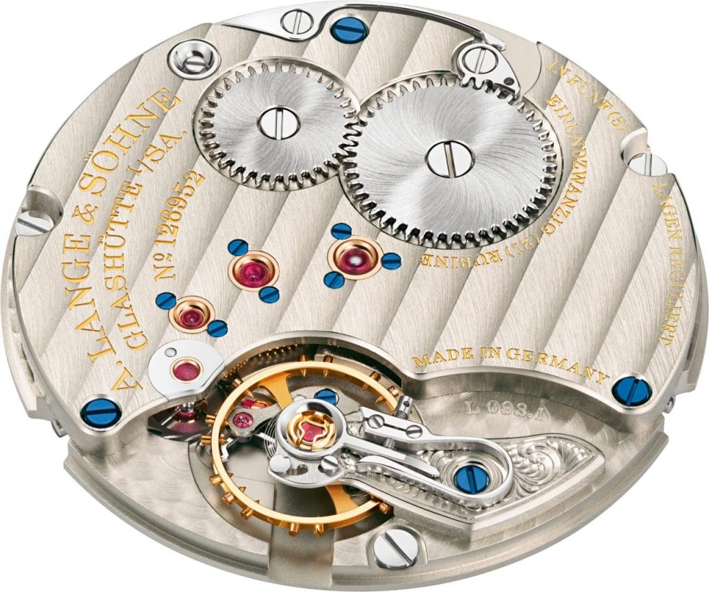 | Mouvement | Calibre L093.1 de manufacture Lange ; remontage manuel, fabriqué selon les plus hauts critères de qualité Lange, décoré et assemblé à la main ; réglage de précision en cinq positions ; platines et ponts en maillechort non traité ; coq de balancier gravé à la main |