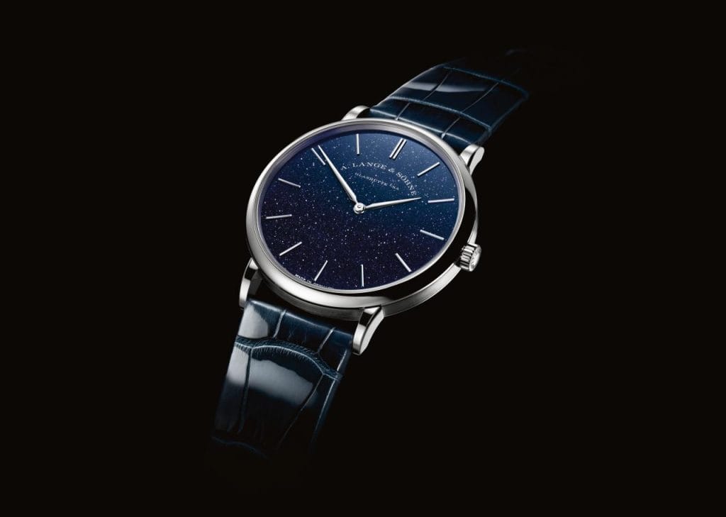 Tout en élégance, la dernière variante de la SAXONIA PLATE repose sur le principe du « less is more ». Son fin boîtier en or blanc, de seulement 6,2 millimètres d’épaisseur, présente un diamètre de 39 millimètres. La teinte qui habille cet élément se poursuit sur les deux aiguilles élancées des heures et des minutes, ainsi que sur les douze bâtons des heures en or rhodié. Les aiguilles et appliques contrastent en outre nettement sur le cadran bleu cuivré, qui, en argent massif, est recouvert d’une légère couche de verre aventuriné aux reflets délicats. Ce revêtement très raffiné est le fruit d’un processus manufacturier sophistiqué, qui puise ses origines dans la Venise du XVIIe siècle. Des cristaux d’oxyde de cuivre de taille microscopique donnent vie au bleu profond du cadran par leur jeu de reflets, qui rappellent les étoiles illuminant un ciel au coeur de la nuit. Un bracelet cousu main en cuir d’alligator, également dans les nuances bleu foncé, complète cet ensemble éblouissant.