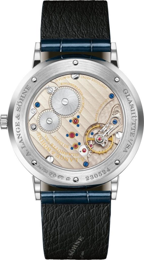 À cette élégance extérieure épurée répond un mouvement à remontage manuel fini selon les plus hauts critères de qualité de l’horlogerie saxonne. Parmi les prouesses techniques du calibre de manufacture L093.1 de seulement 2,9 millimètres figure un barillet plat, qui, malgré sa taille compacte, offre une réserve de marche de près de 72 heures. Ornées sur la partie supérieure d’un décor effet soleil, la roue à rochet et la roue à couronne sont intégrées de manière visible à une platine trois quarts à fines côtes de Glashütte. Le regard ne manquera pas d’être attiré vers la partie réglante que l’on peut observer à côté de la platine trois quarts : sous le coq de balancier gravé à la main doté du ressort à col de cygne caractéristique oscille un balancier à vis classique avec spiral de fabrication propre. Les trois chatons en or polis, qui sont maintenus par des vis bleuies, apportent la dernière touche au tableau d’un garde-temps Lange parfait jusque dans les moindres détails.