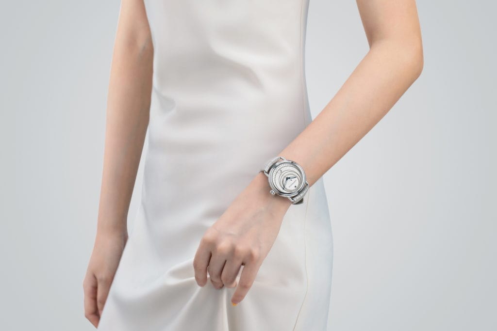 Elle se fait particulièrement remarquer par son cadran raffiné, garni d’appliques circulaires, en harmonie avec les lignes doucement arrondies du boîtier. L’œil de l’observatrice est irrésistiblement attiré par les cercles décroissant vers le zénith, qui mettent en évidence un saphir bleu.