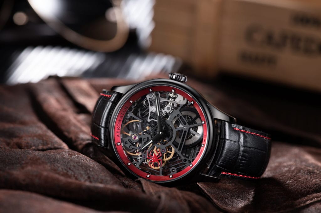 Et comme l’araignée Aerowatch est également active la nuit, les aiguilles et les index ont été enduits de Super-LumiNova. Le bracelet en cuir gaufré à couture piquée rouge et boucle déployante complète à la perfection l’esthétique incontournable de la «Spider Squelette». Avec une Spider à son poignet, un homme moderne et sensible au style pourrait facilement se donner un petit air de Spiderman élégant et aérien.